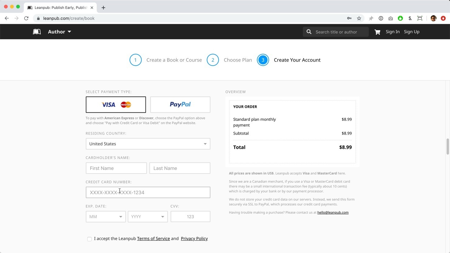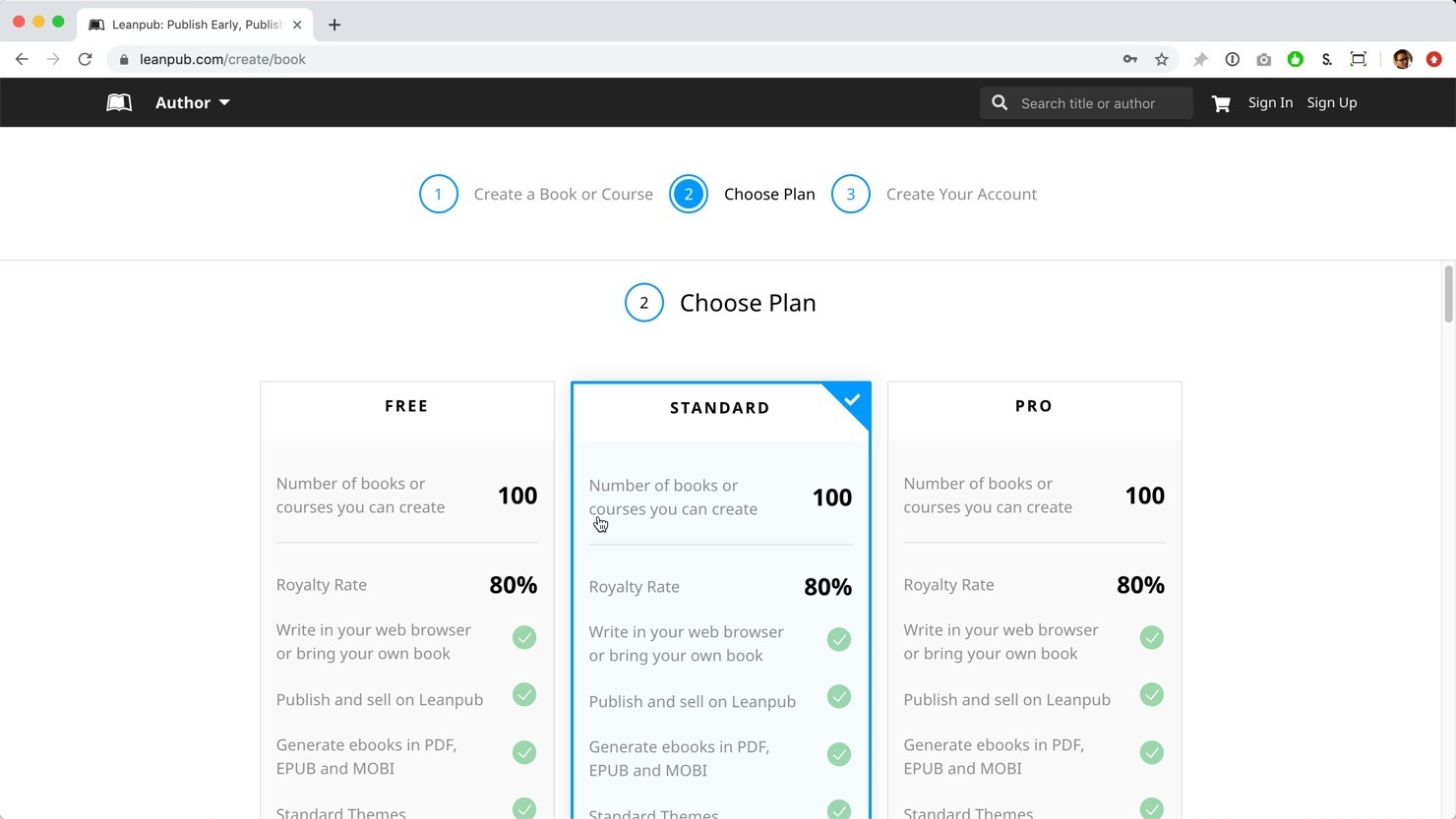 When you scroll down, you will see the subscription plan options. By default, “Standard” will be selected, if you are setting up your first book in Leanpub.