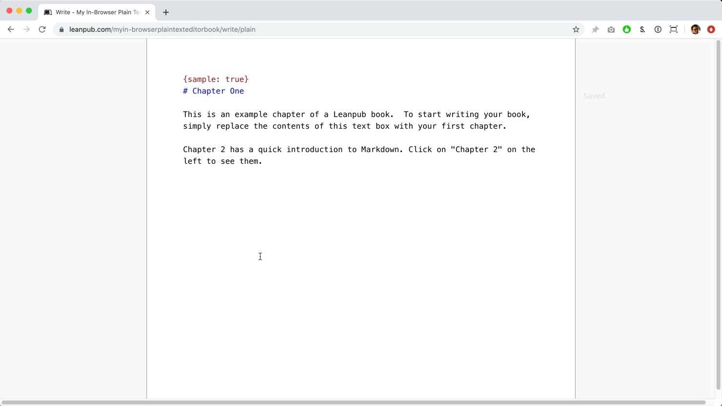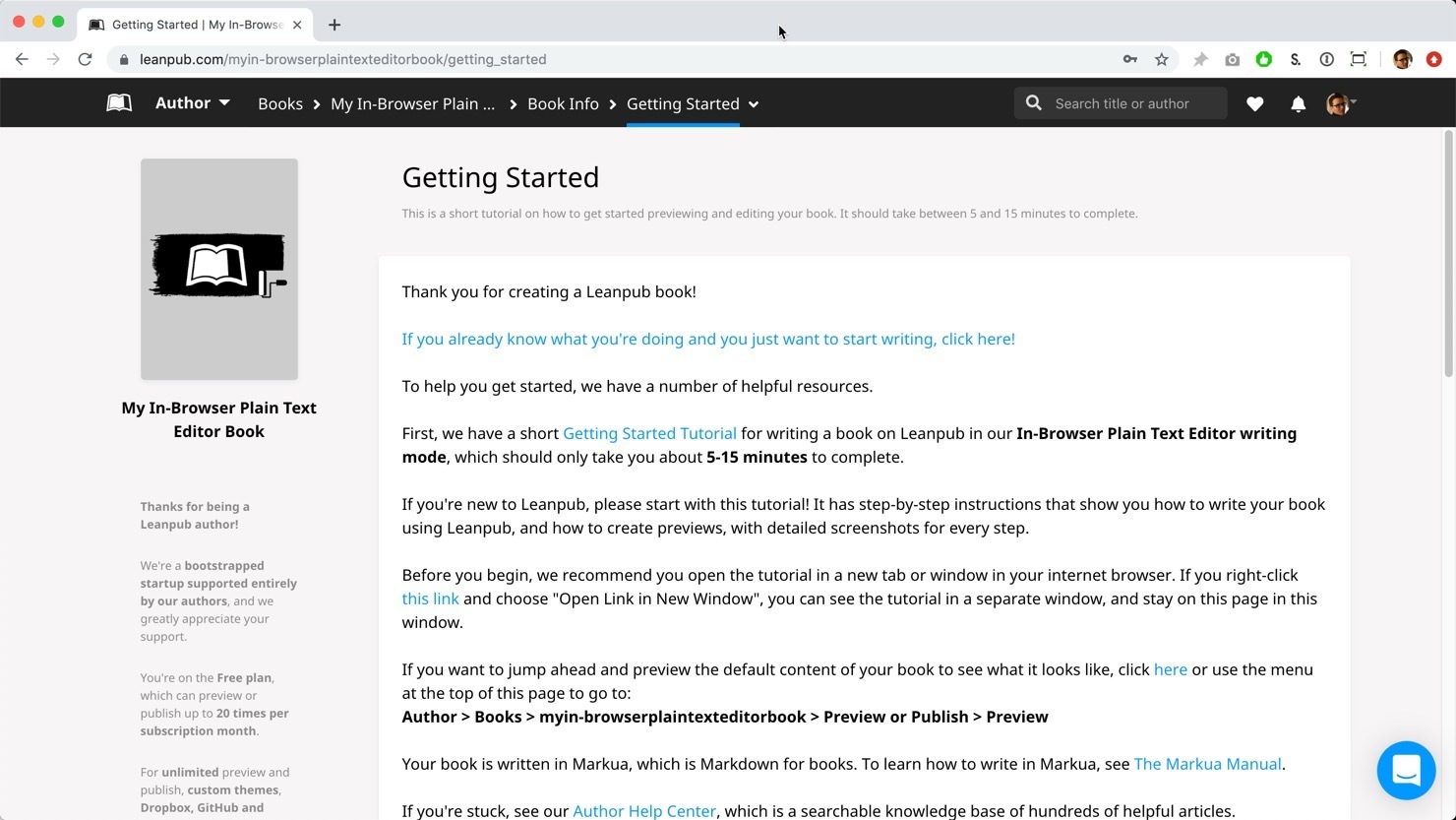 On this page, you will see lots of helpful information that we recommend you read at some point. However, for this tutorial, let’s just dive in to the In-Browser Plain Text editor, where you will spend your time writing your book!