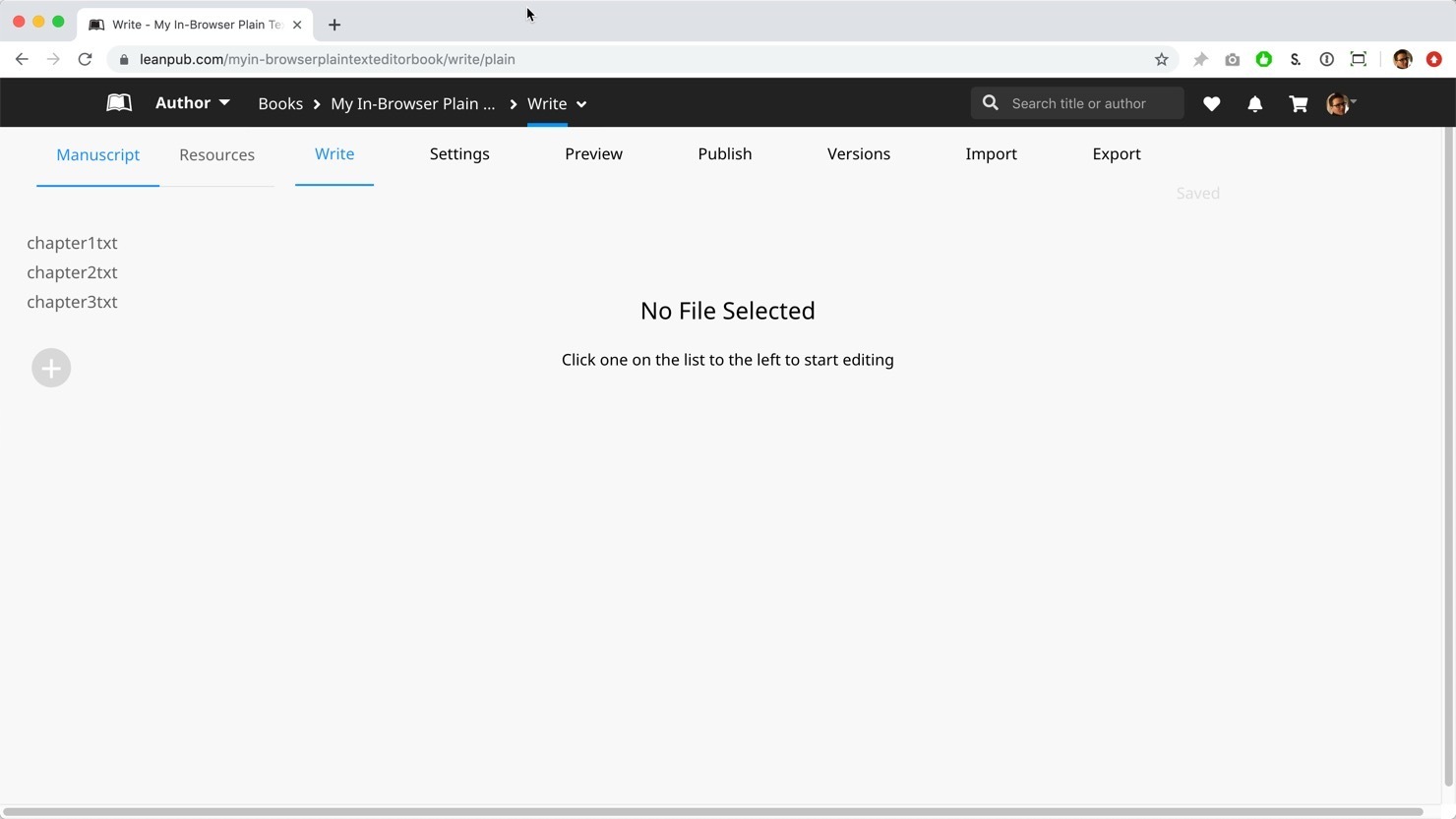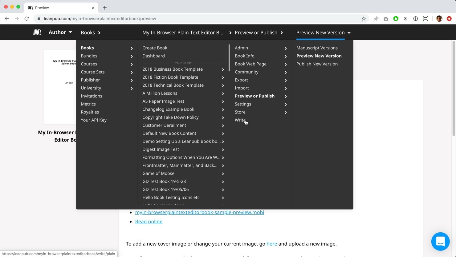 Let’s go back to the Write page for your book. To do that, select Write from the Leanpub menu: