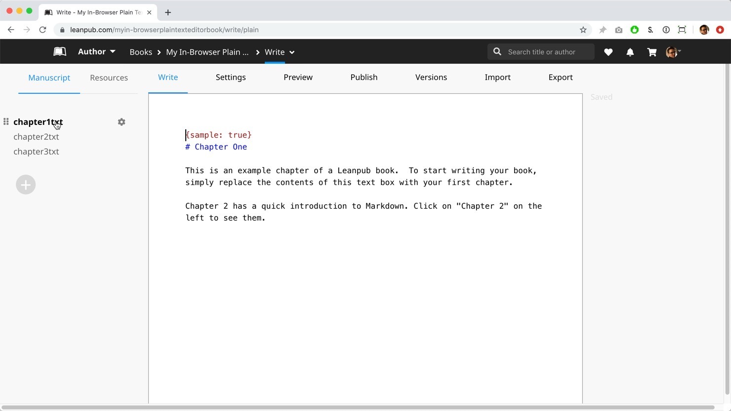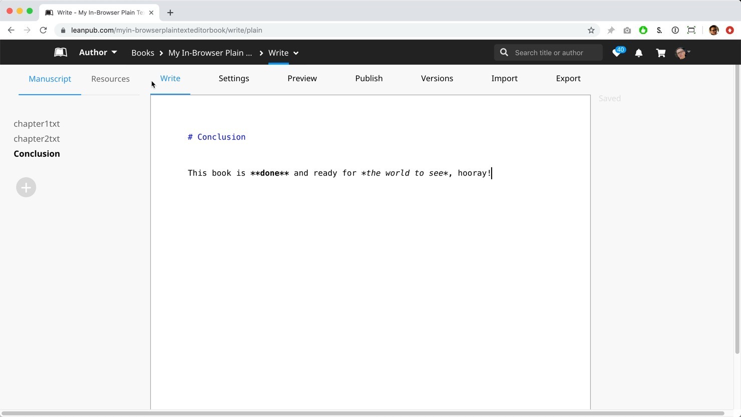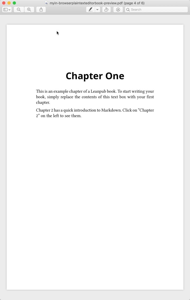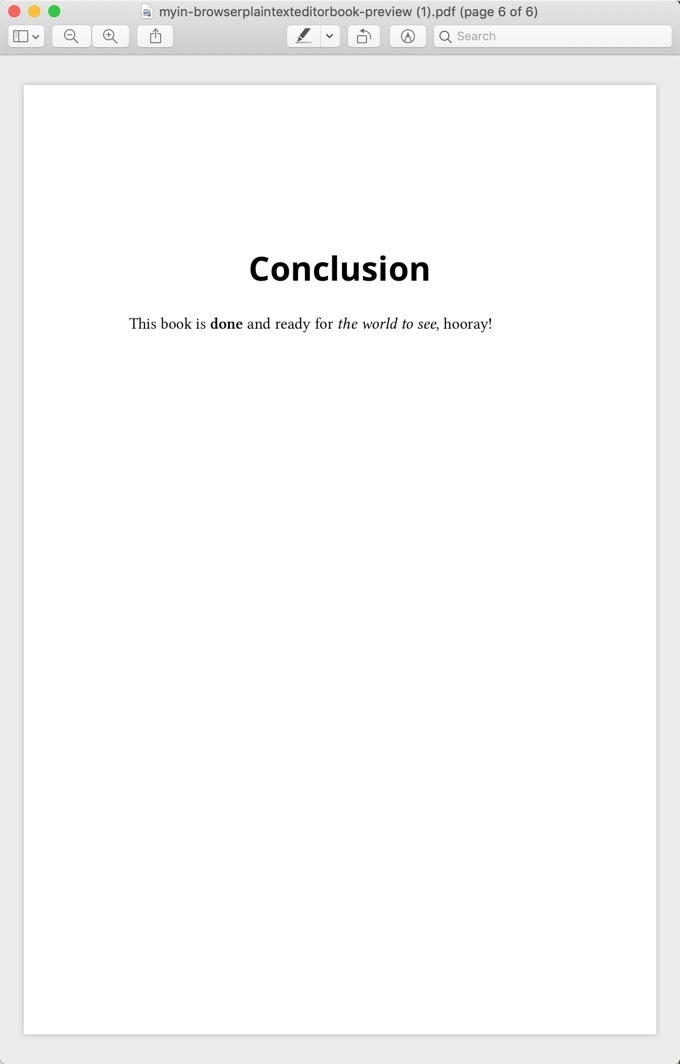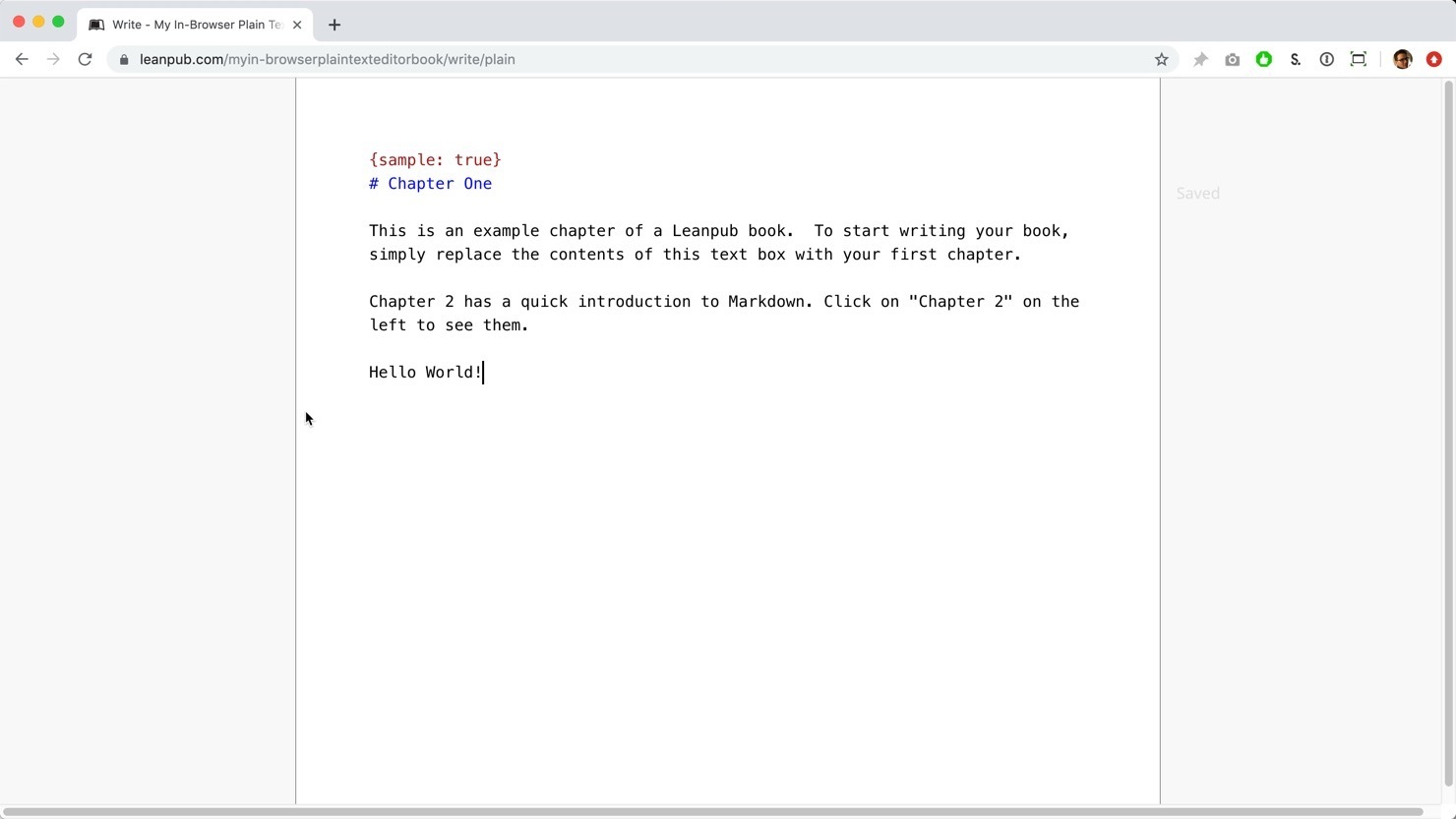 Congratulations! You’ve completed the Getting Started walkthrough for writing a book in Leanpub using our In-Browser Plain Text Editor.