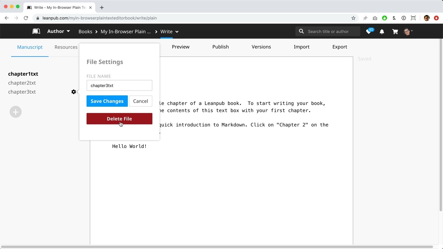 We want to delete this chapter, so next, click the red “Delete File” button: