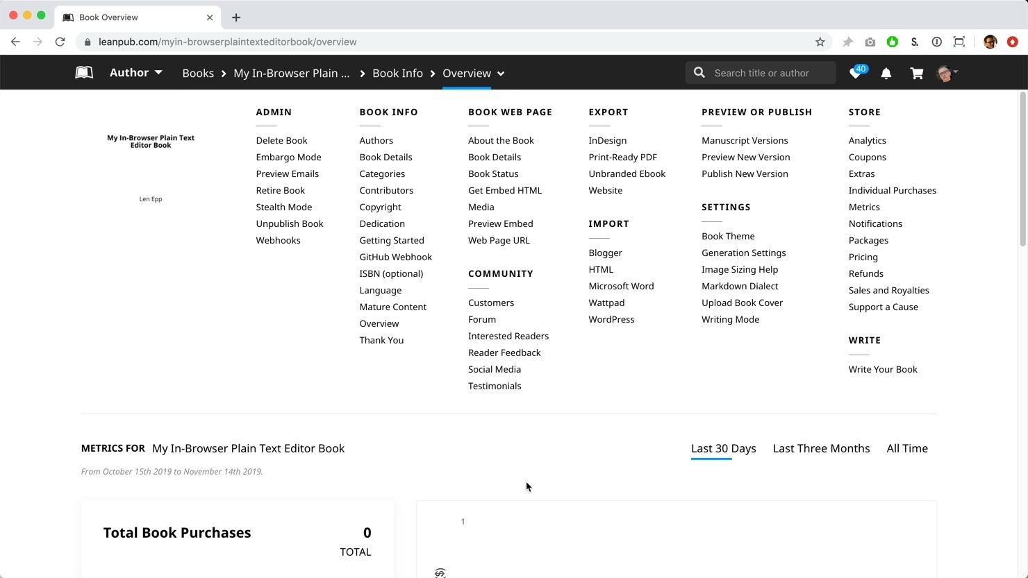On the Overview page, you can see all the pages you need to get your book set up on Leanpub, like “Upload Book Cover” and the “Book Details” page, where you can explain what your book is about to potential readers.