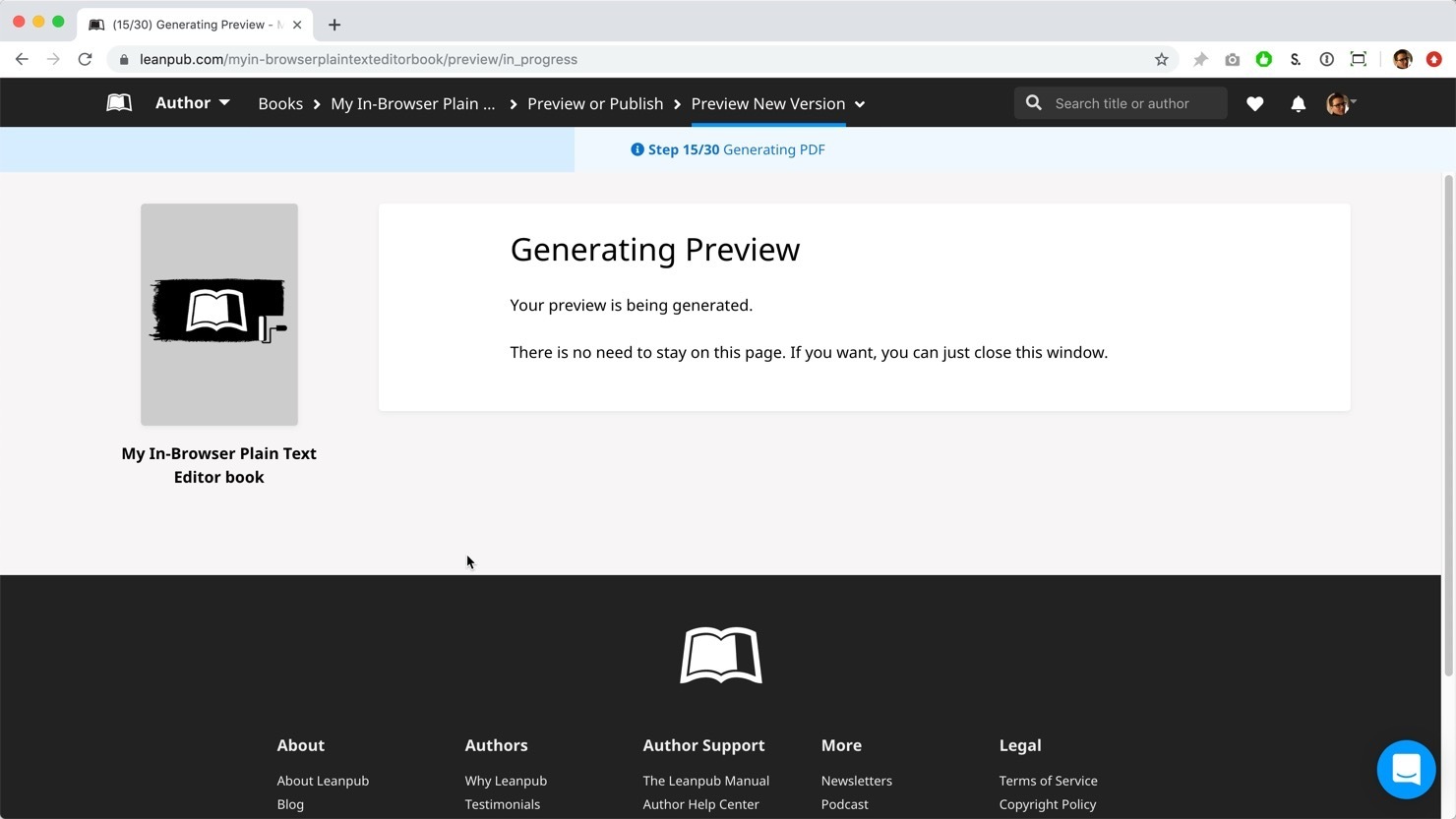 You will now see a progress bar at the top of the page. This shows the steps carried out by Leanpub’s book generators, every time you create a new Preview.