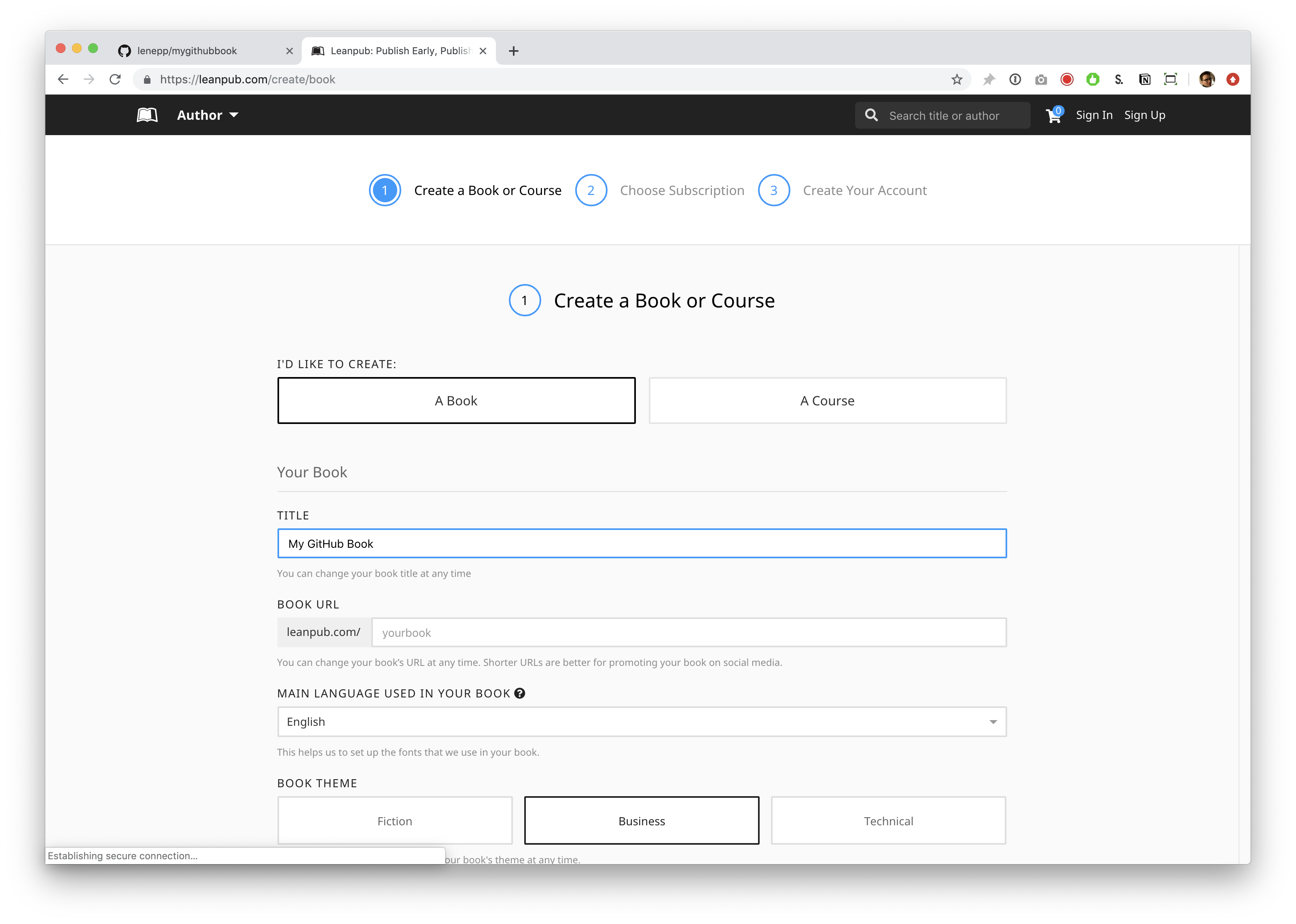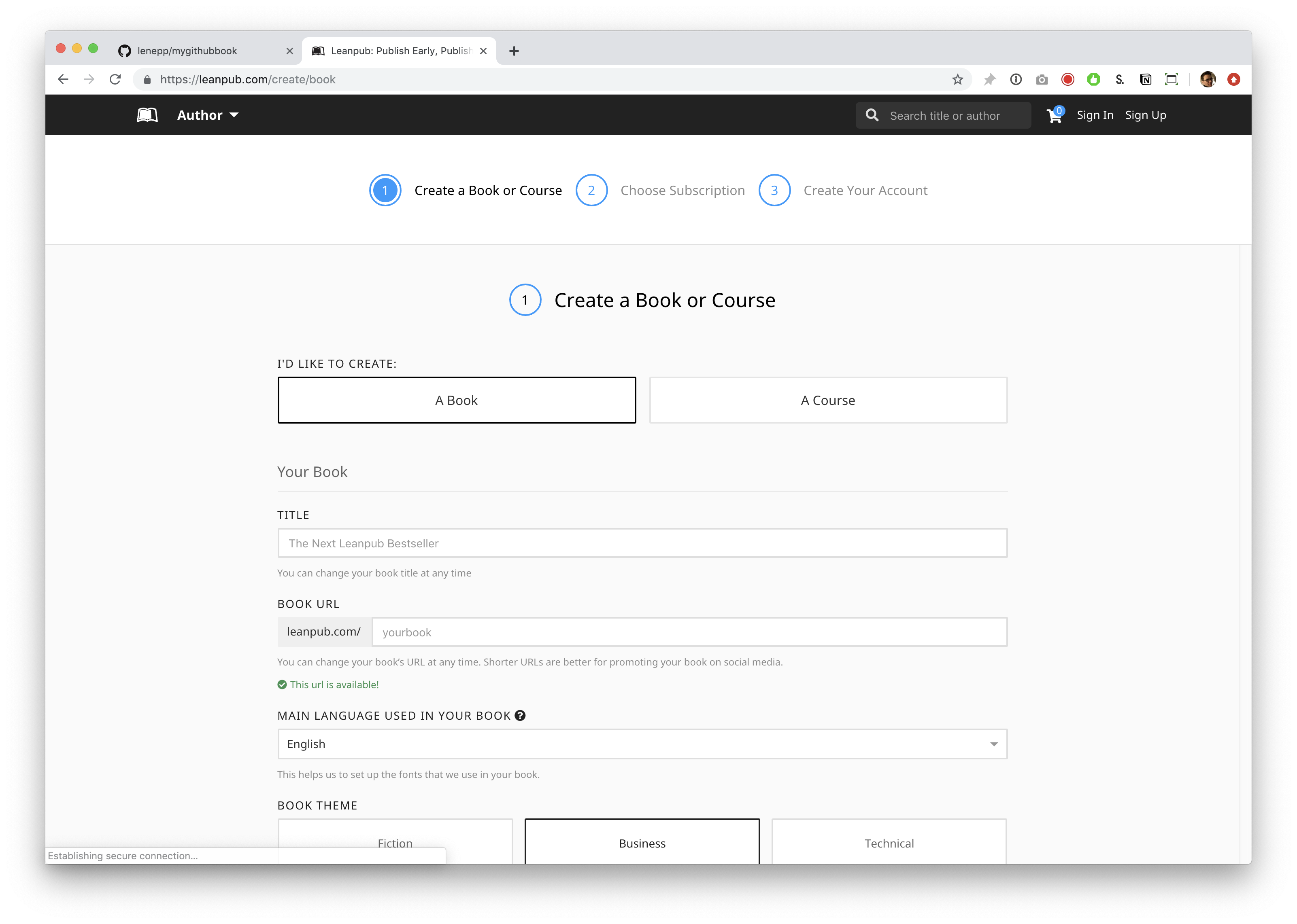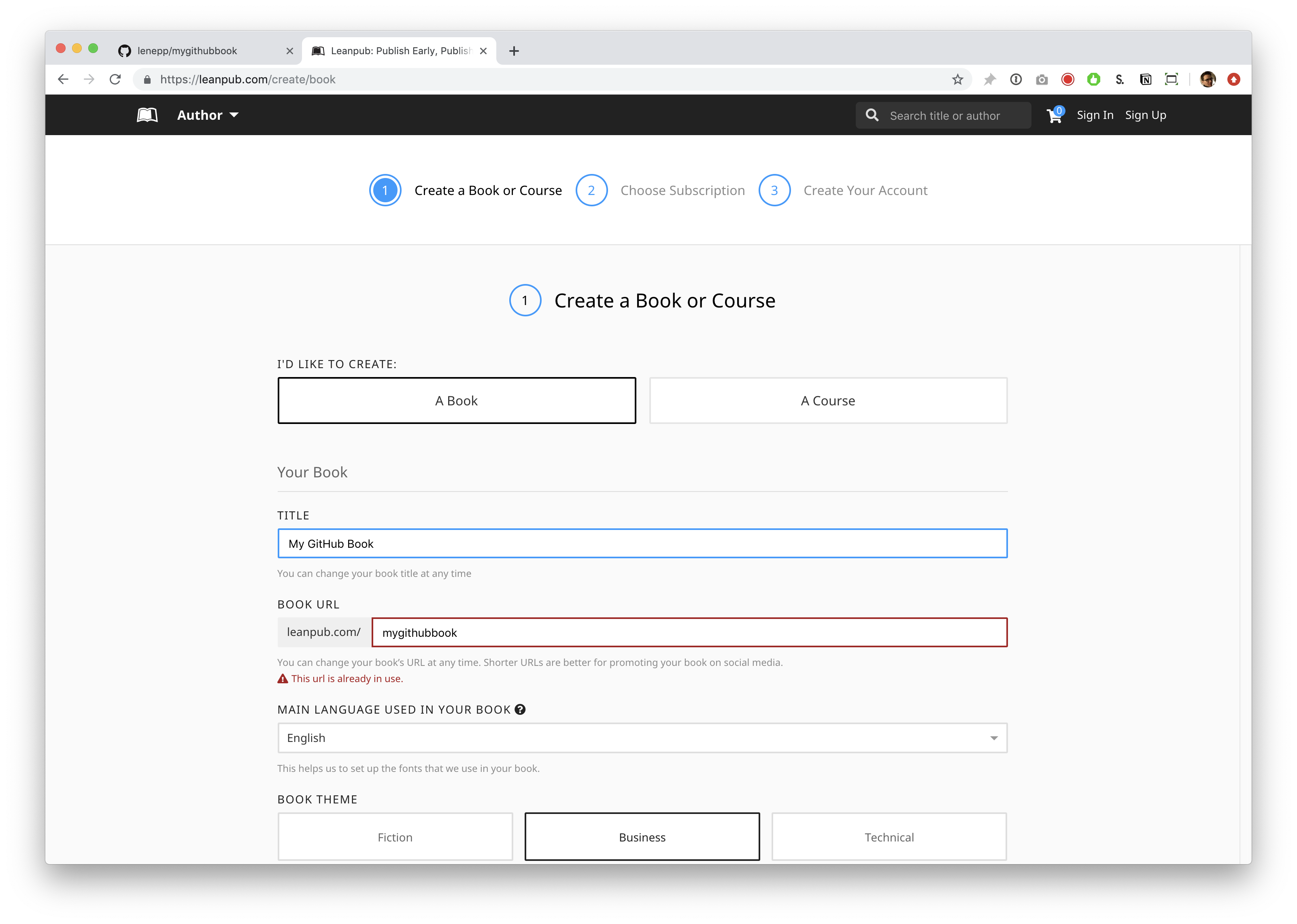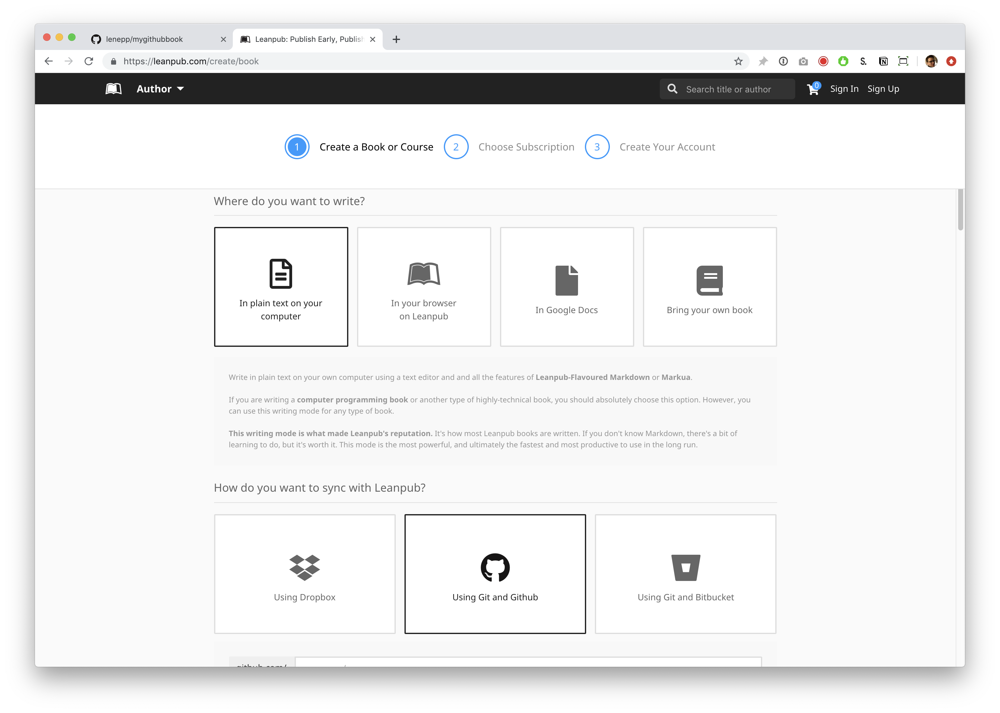 Go to https://leanpub.com/create/book to create a book in GitHub writing mode.