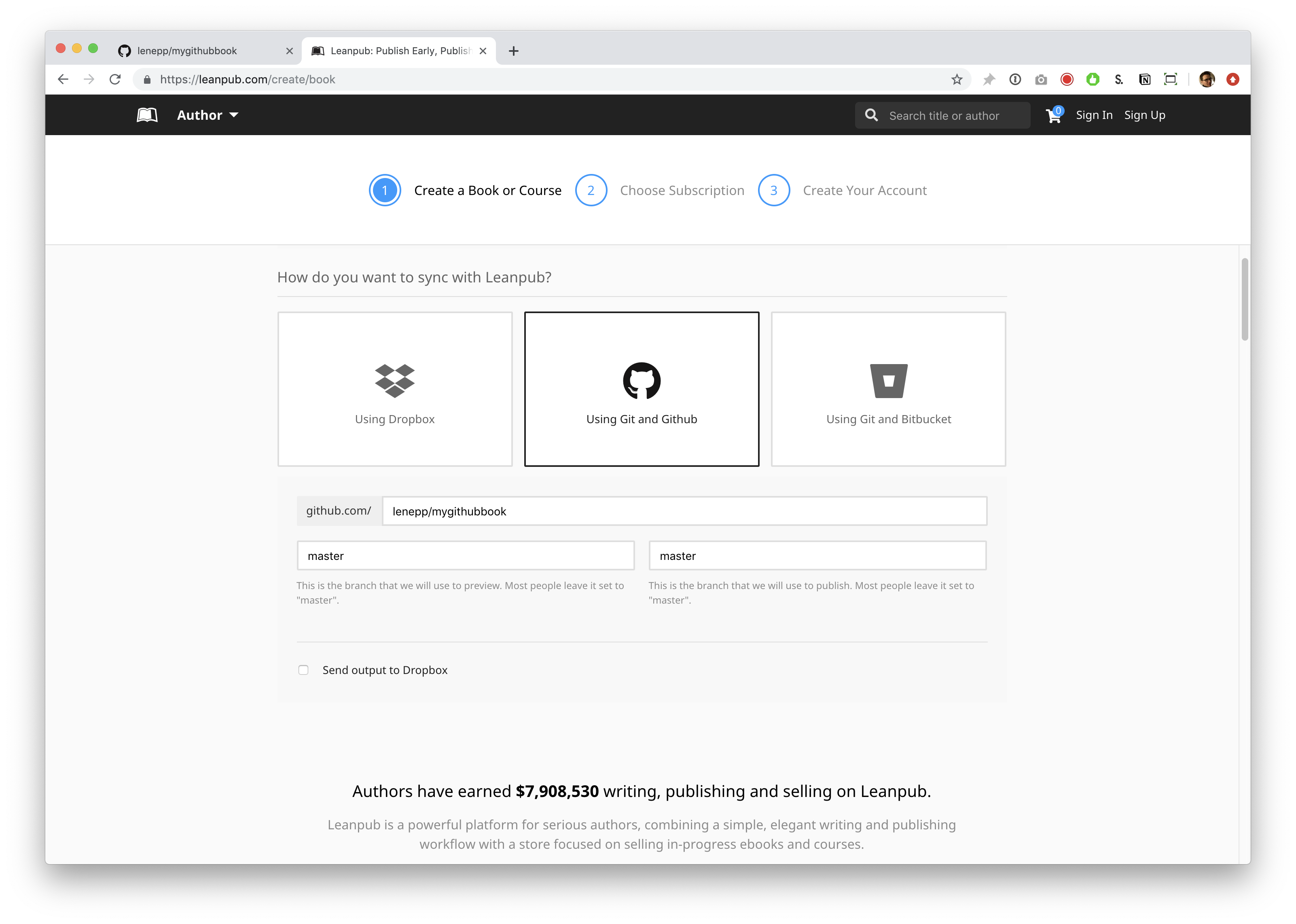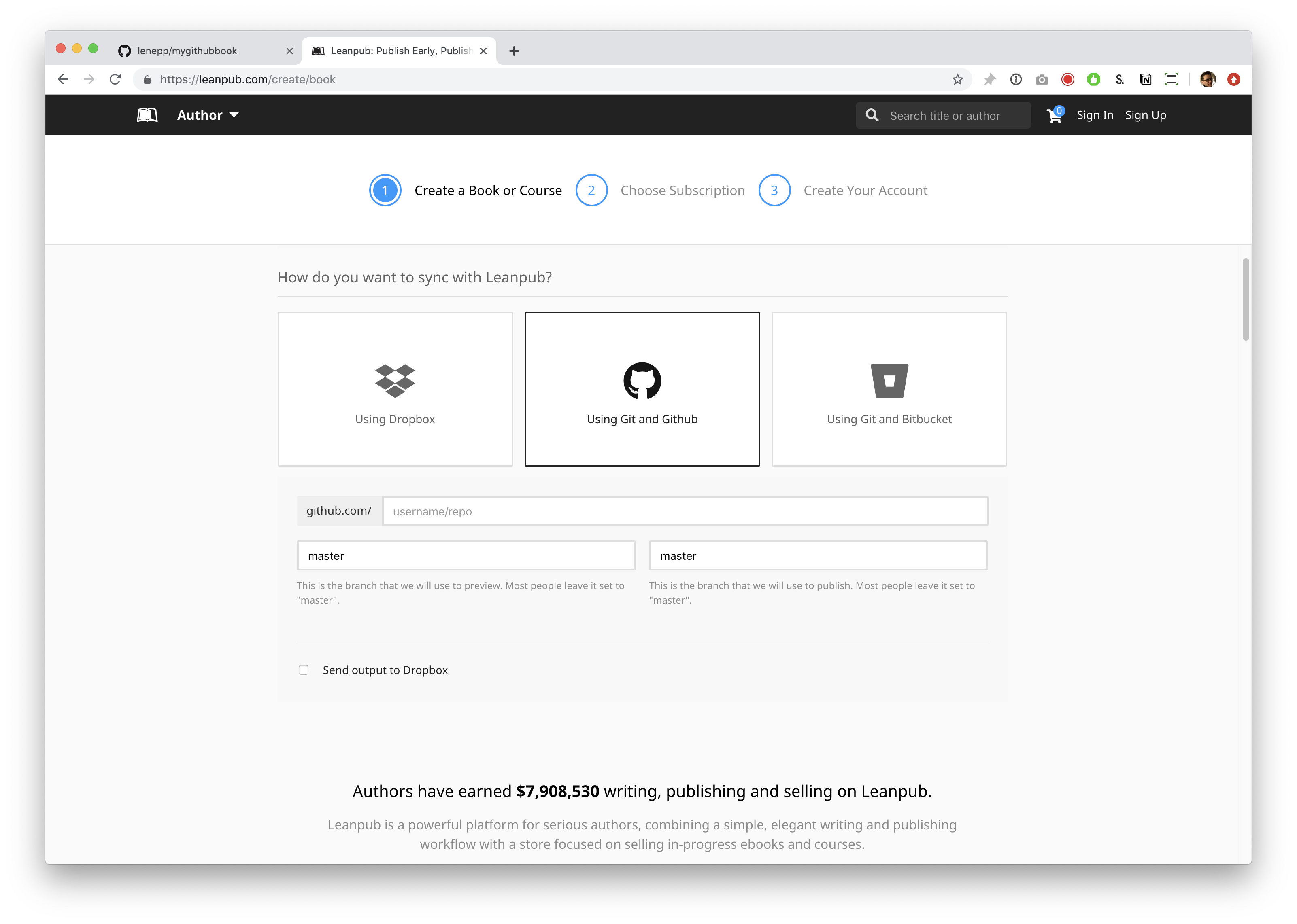 This will take you to a page where you can set up a new repository for your Leanpub book.
