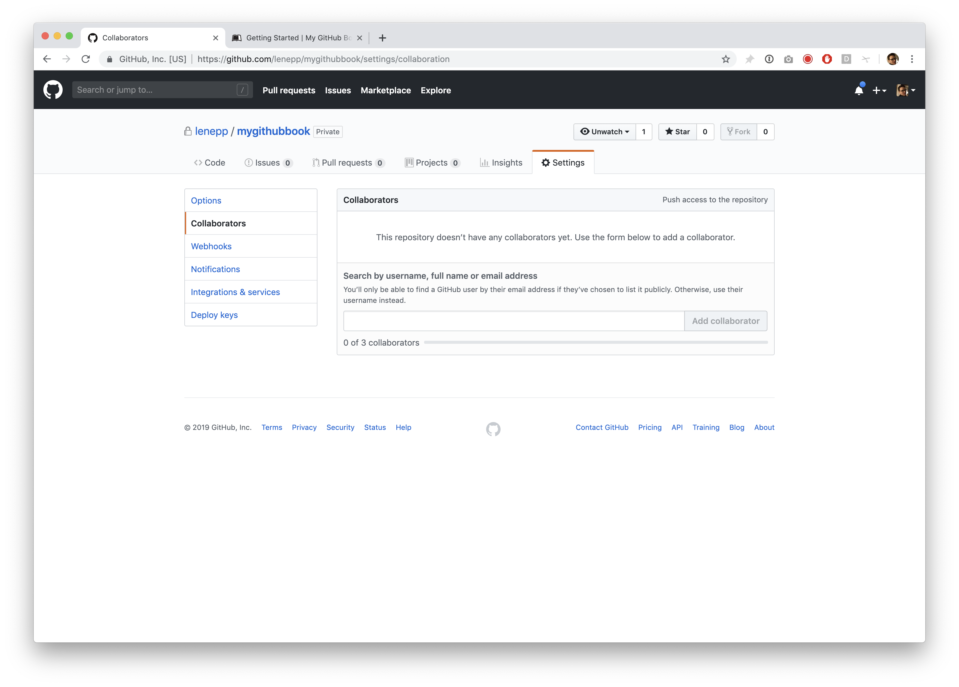 Click on “Collaborators” in the menu on the left, to go to the “Collaborators” page for the repository.