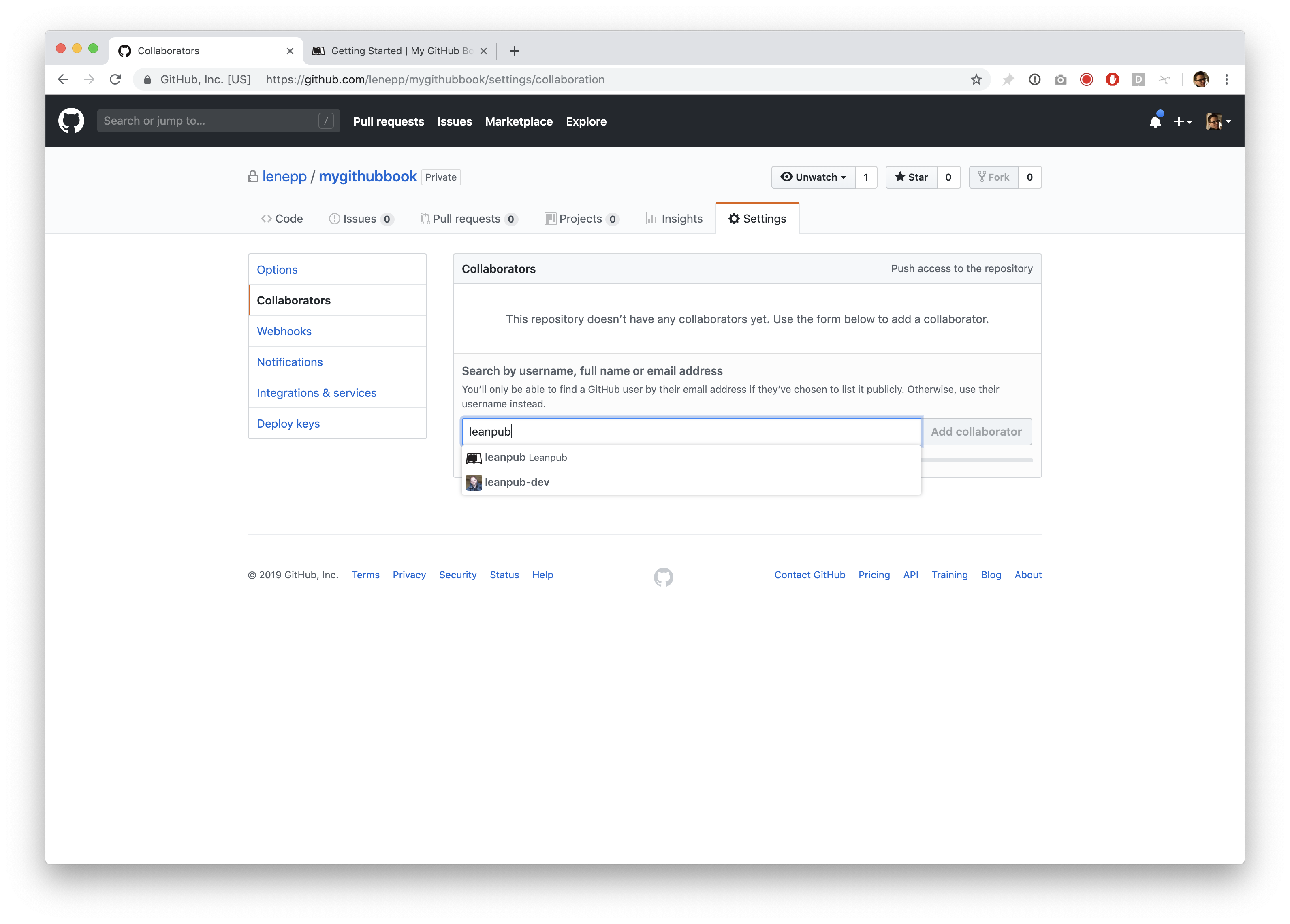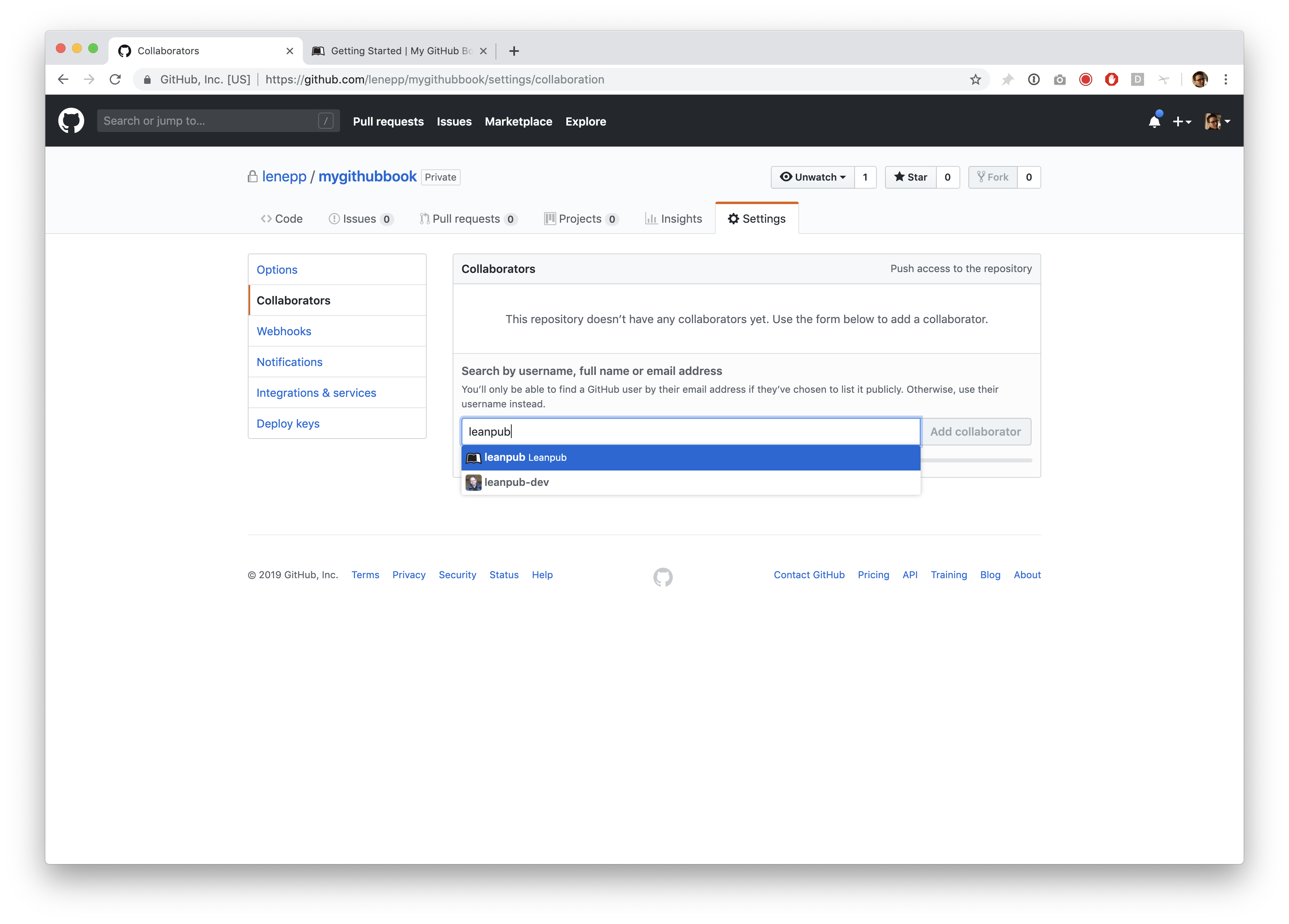 Select the “leanpub” user and click the “Add collaborator” button.