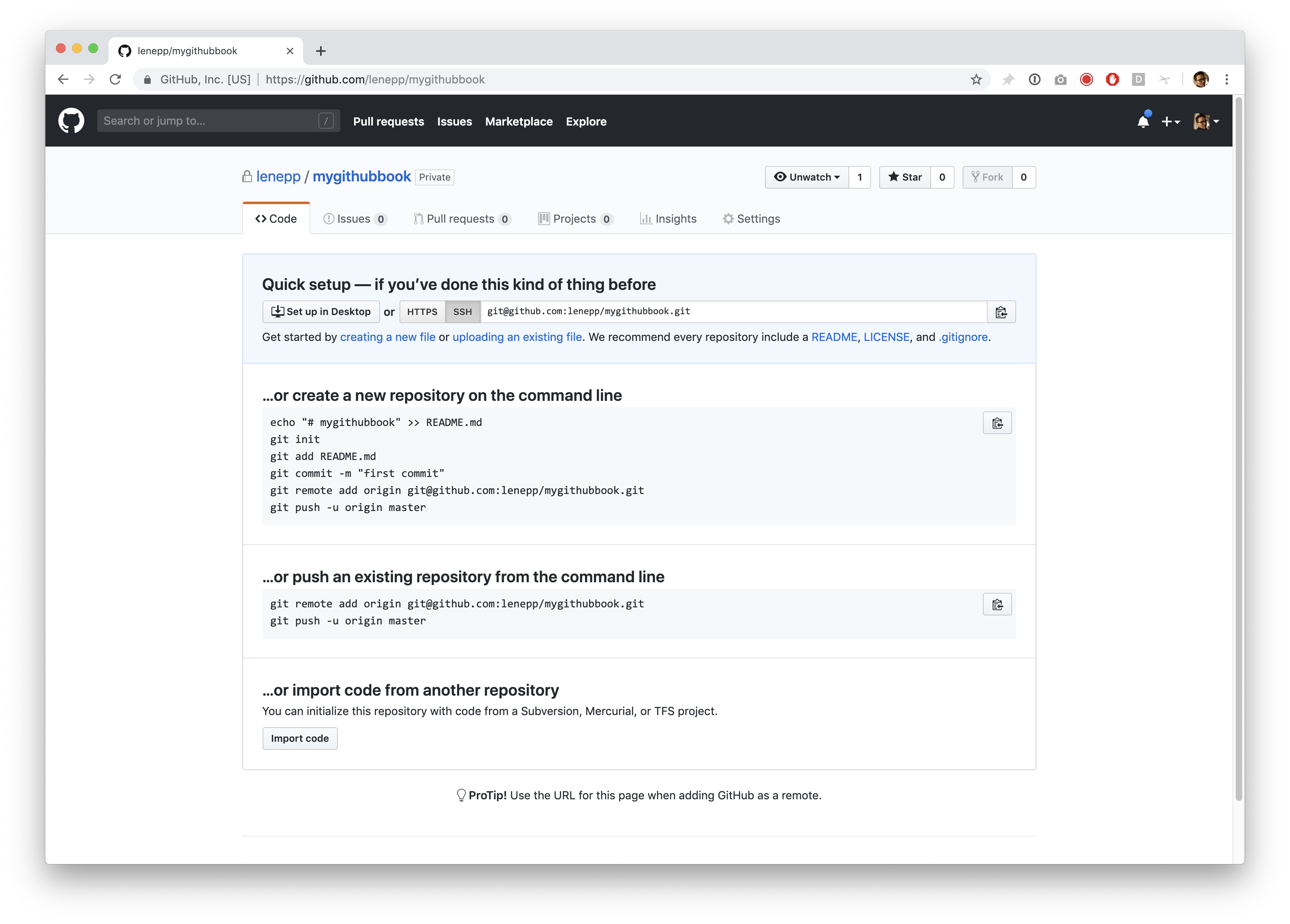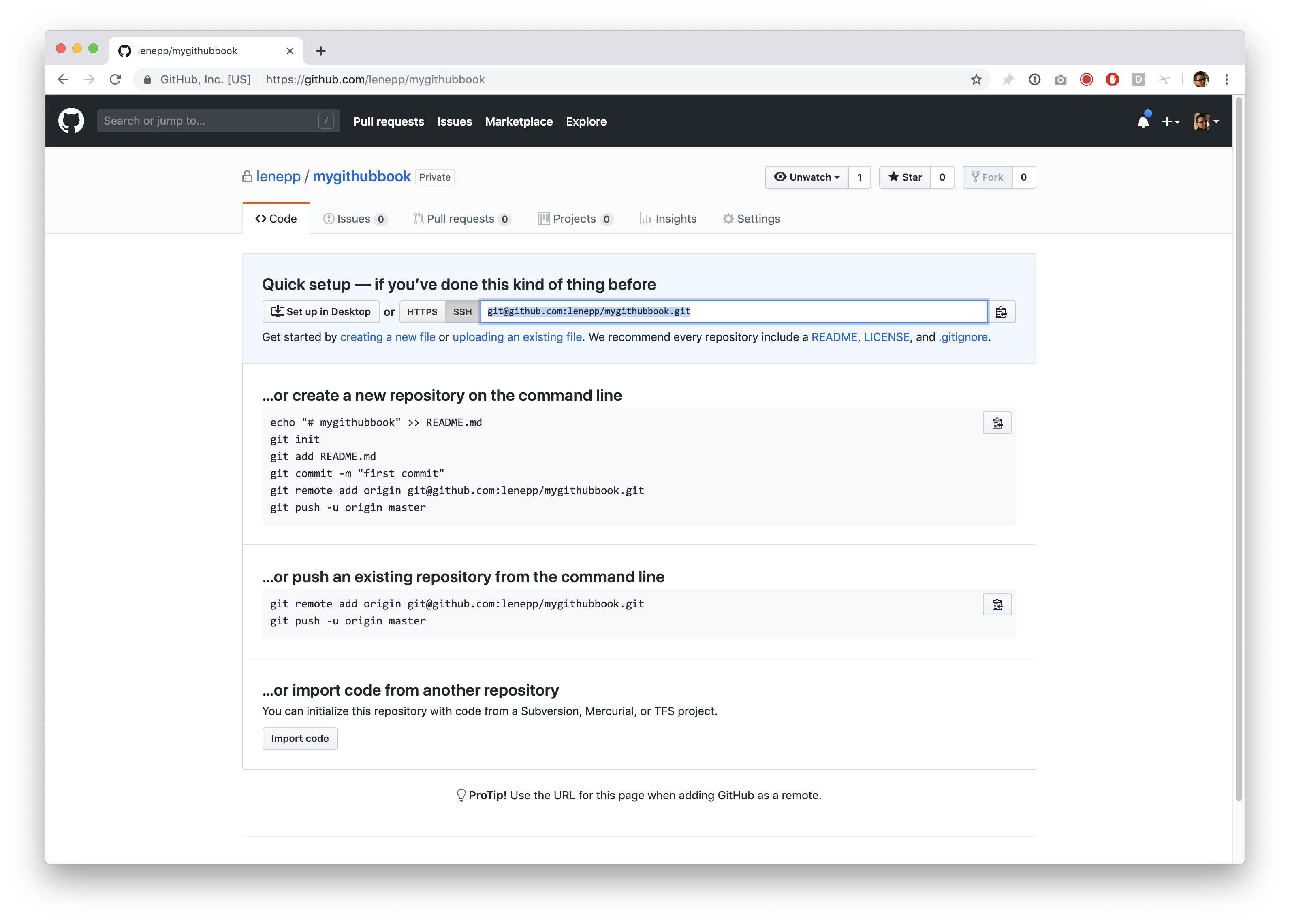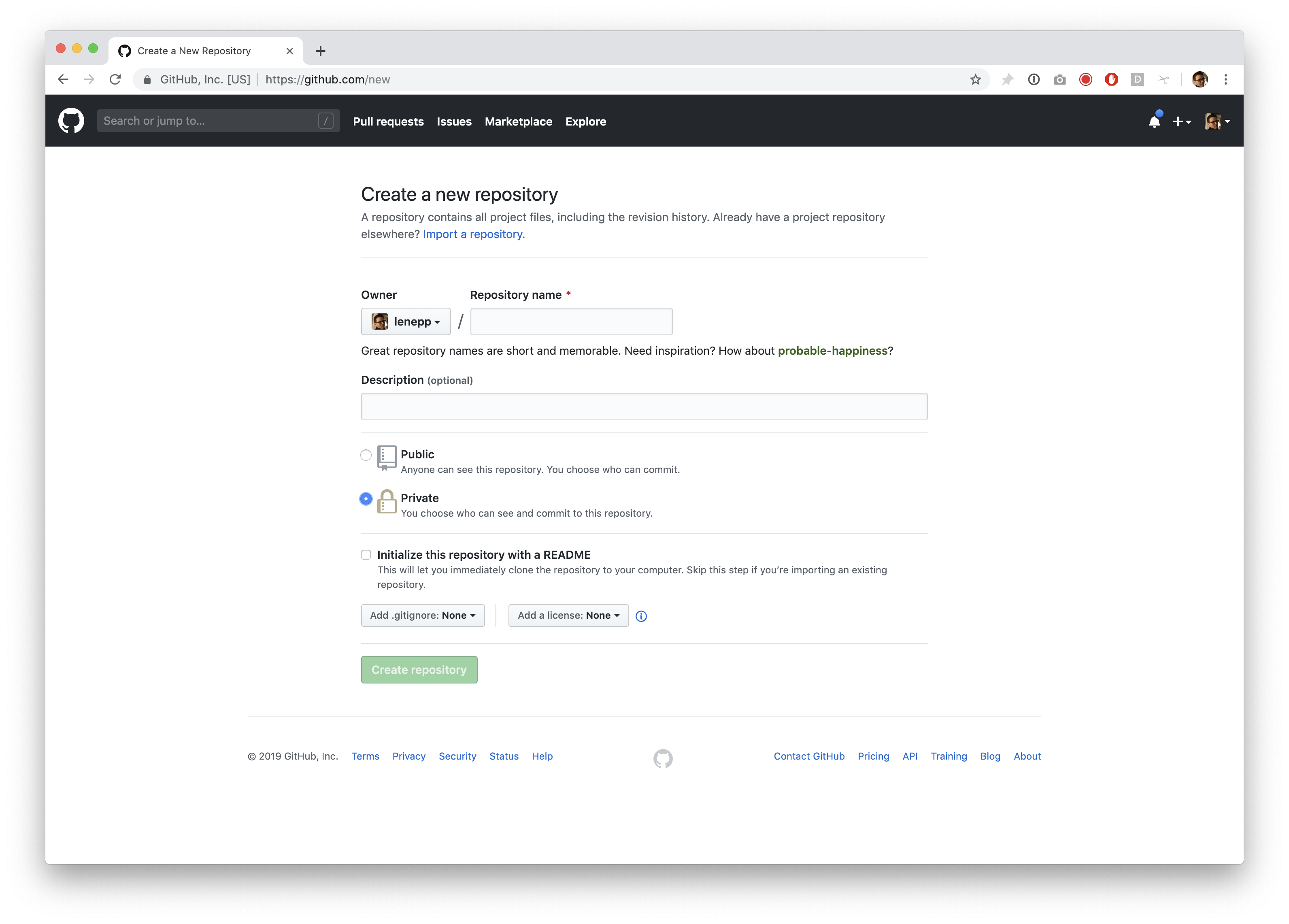 Click the green “Create repository” button. If you want, you can click the checkbox to initialize the repository with a README. It doesn’t matter, but this will get rid of the warning message later.