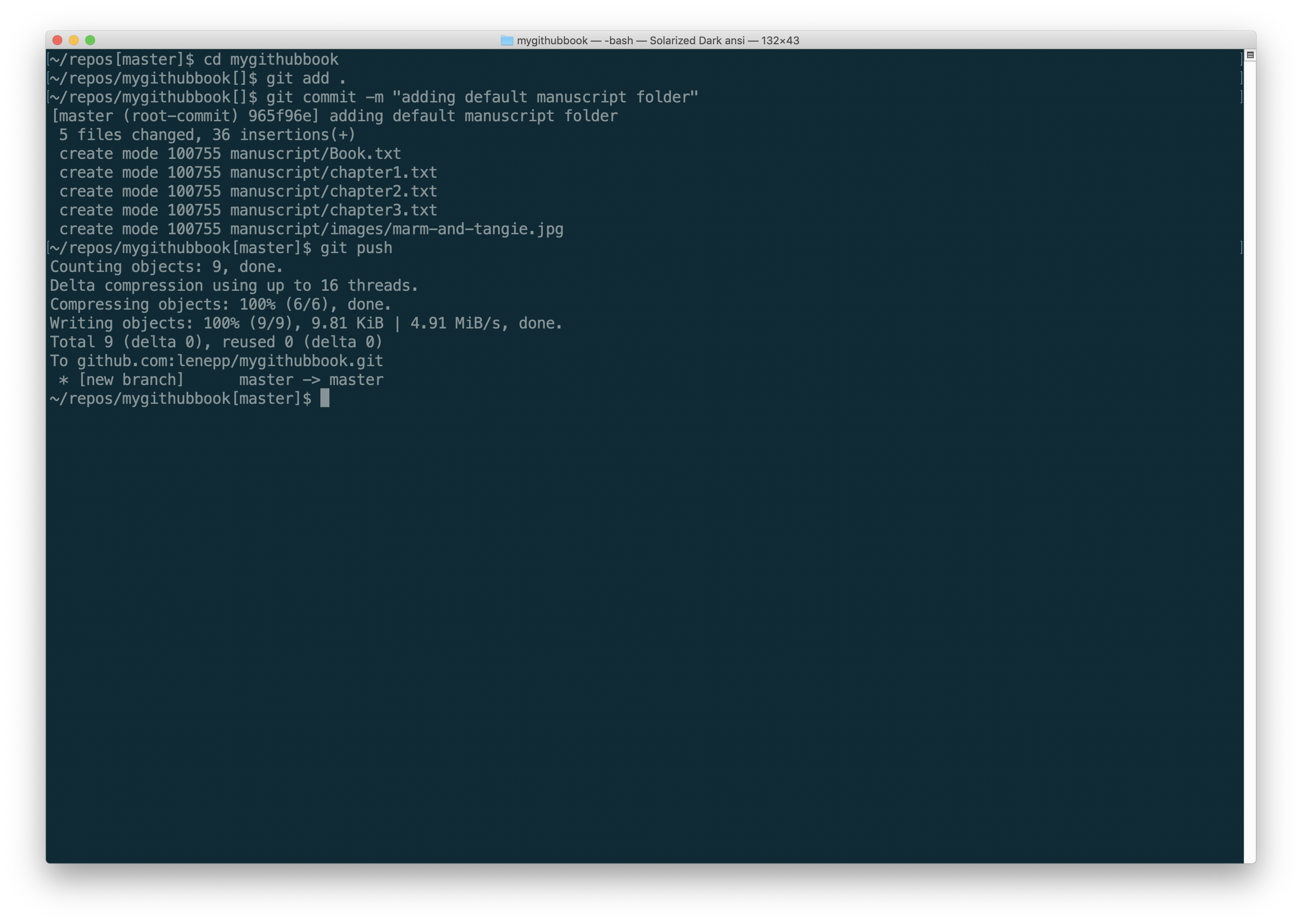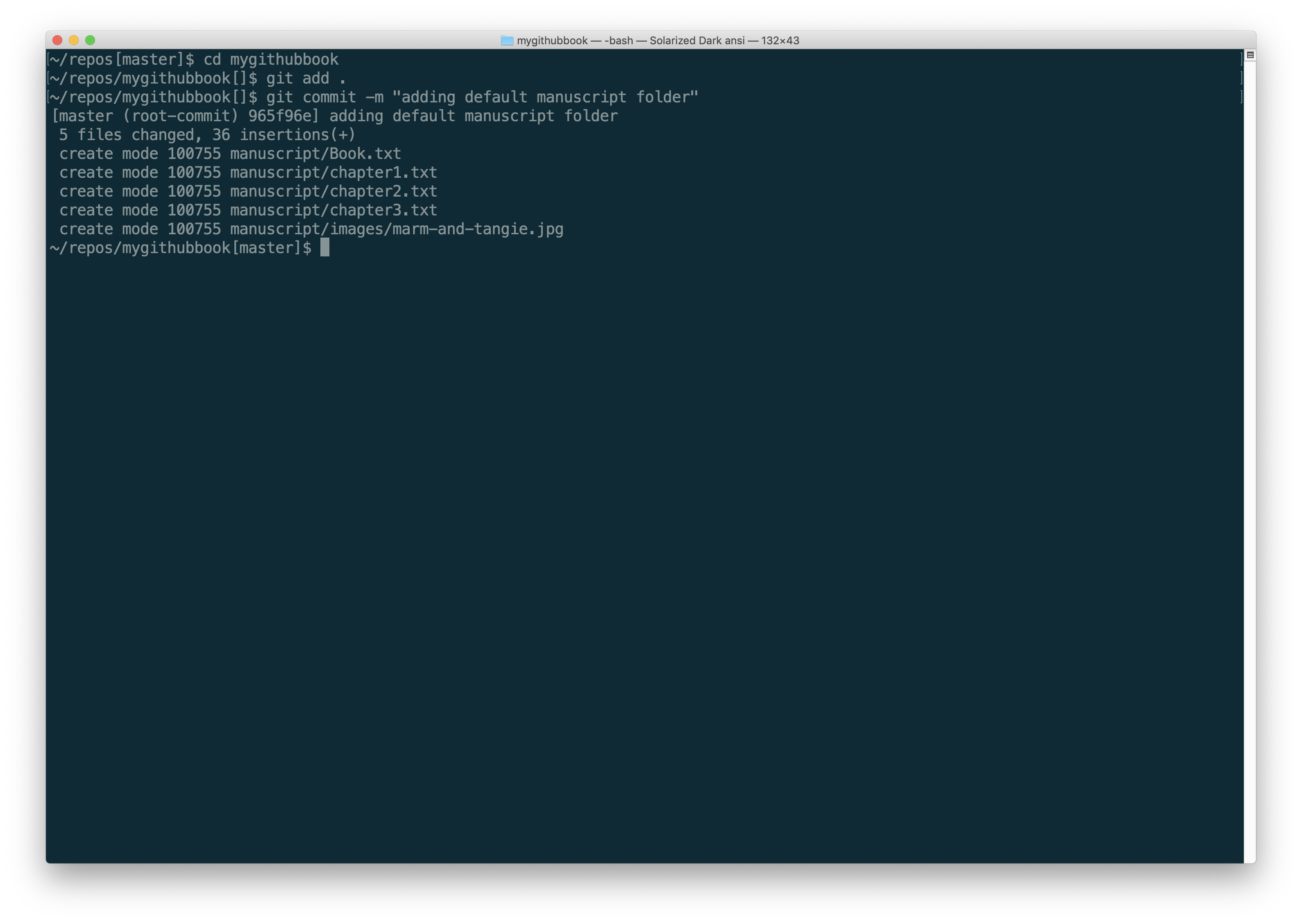 Type git commit -m "adding default manuscript folder". You will see messages indicating that the content has been committed.