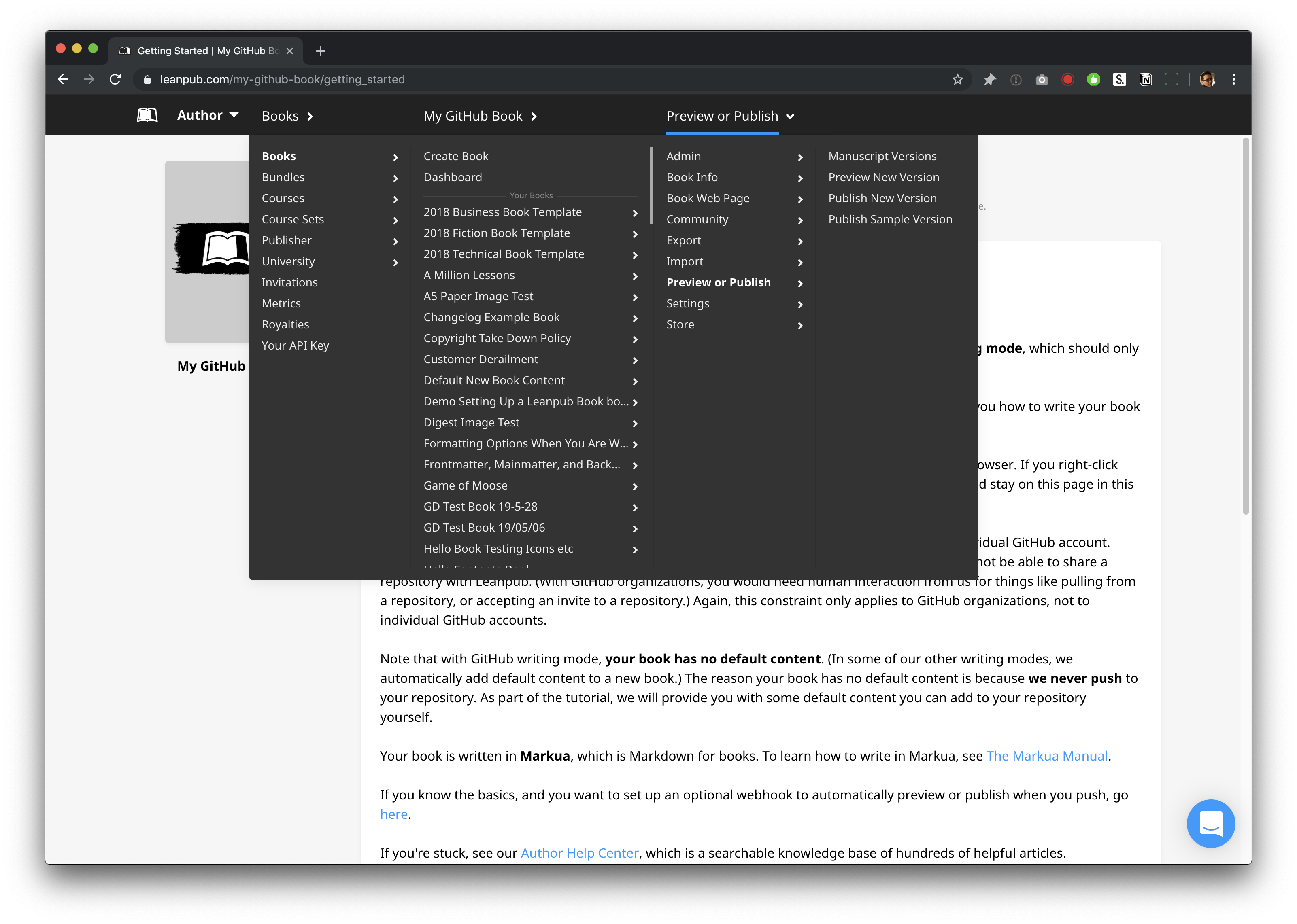 To create your first preview, using the default content we included in your new book, go back to the Getting Started page for your book: