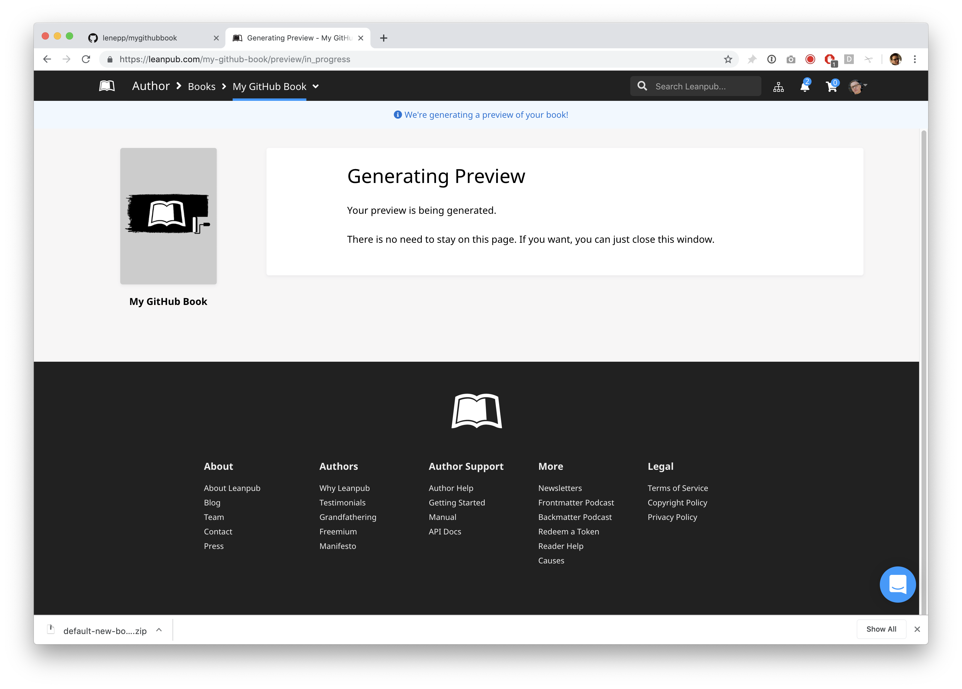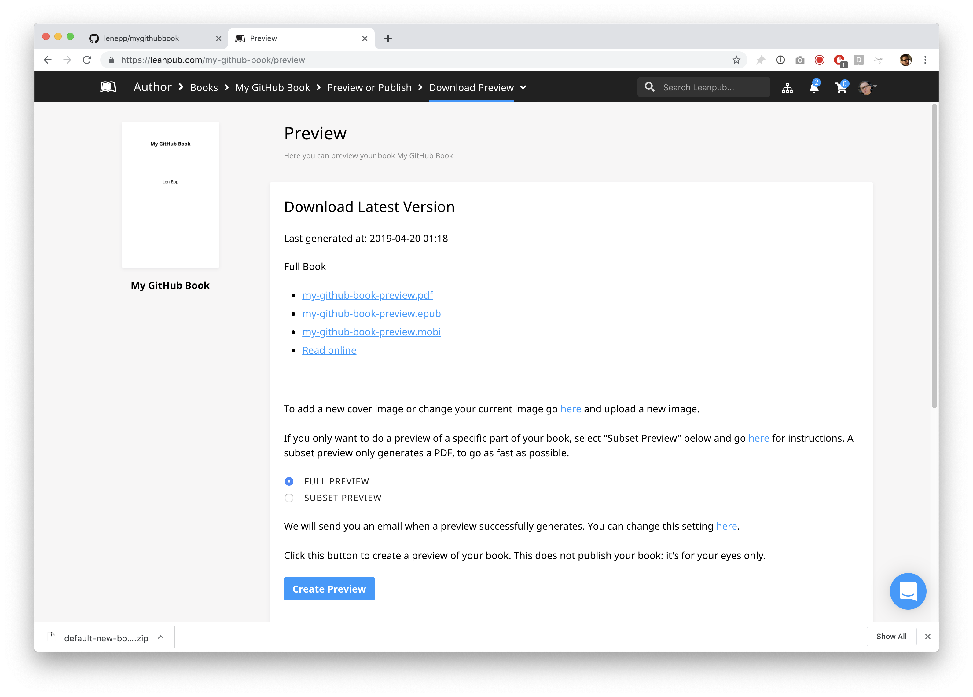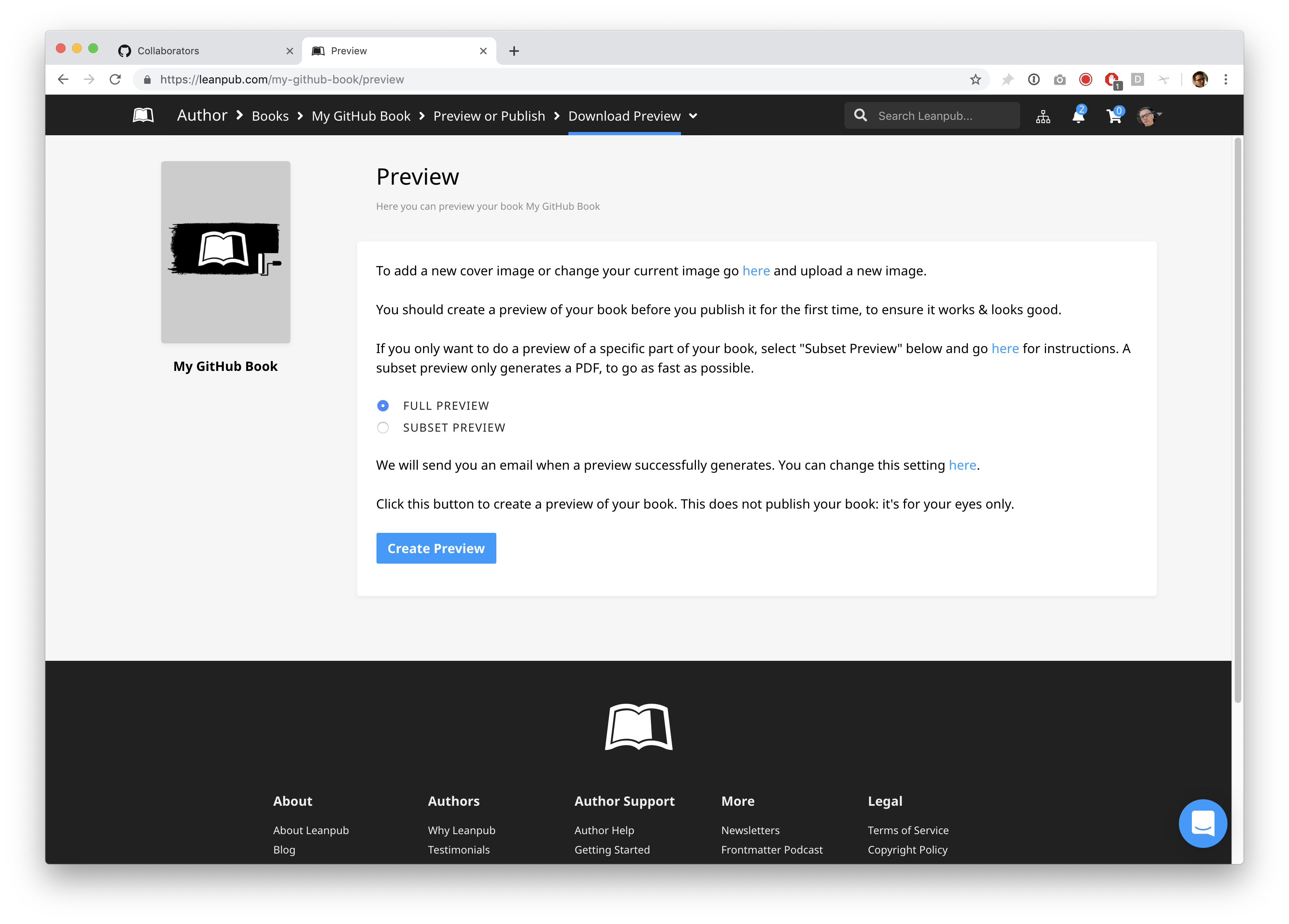 To create a new preview, repeat what you did when you made your first preview, by using the Author menu in Leanpub to go to: