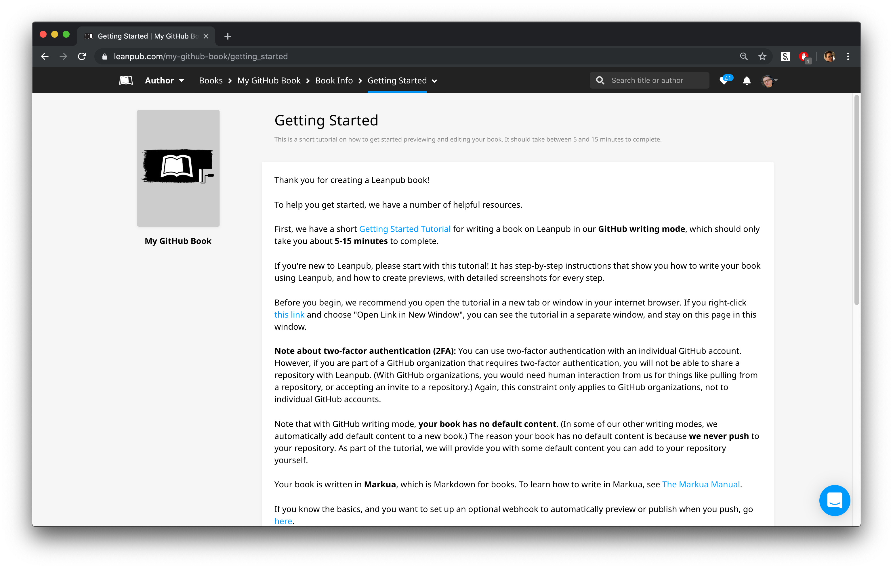 You will now see that you are on the Getting Started page for your book: