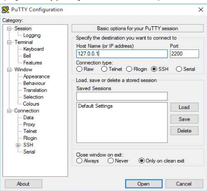 - Ejecutar el programa Putty y configurar el Host Name como aparece en SSH Address en la imagen anterior.