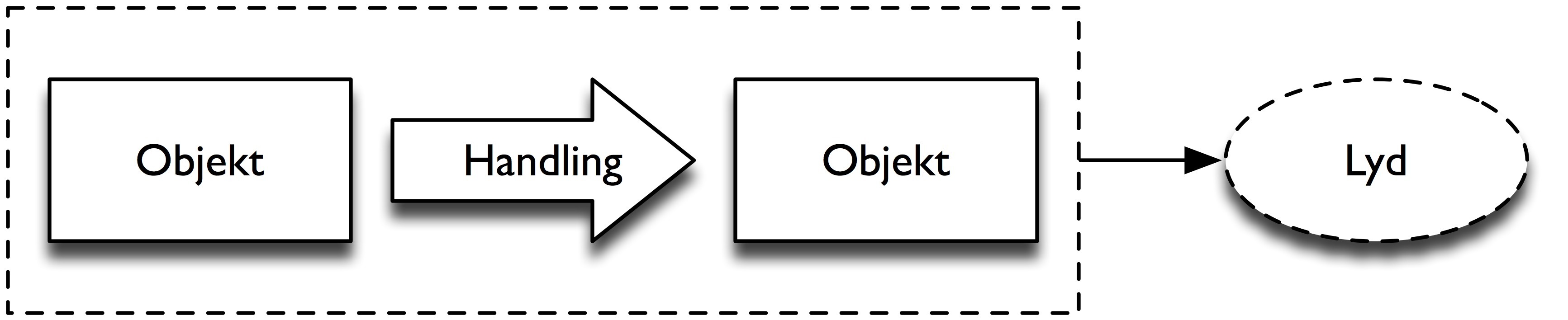 Grunnlaget for en naturlig kobling mellom handling og lyd er at det må være minst to objekter og én lydproduserende handling involvert, slik som det er skissert i figur 52. Et objekt brukes her for å beskrive alle fysiske objekter som kan brukes til lydproduksjon. Dette kan være for eksempel en hånd, et vannglass, en trommestikke, eller en pianohammer. I en naturlig sammenheng er det de materielle egenskapene til objektene, og de mekaniske eller biomekaniske egenskapene til handlingene, som er grunnlaget for lyden som produseres. Gjennom vår erfaring med forskjellige objekter og handlinger har vi bygget opp en forståelse for slike akustiske og mekaniske egenskaper. Det er denne forståelsen som ligger til grunn for vår evne til å forestille oss det klingende resultatet av en lydproduserende handling.