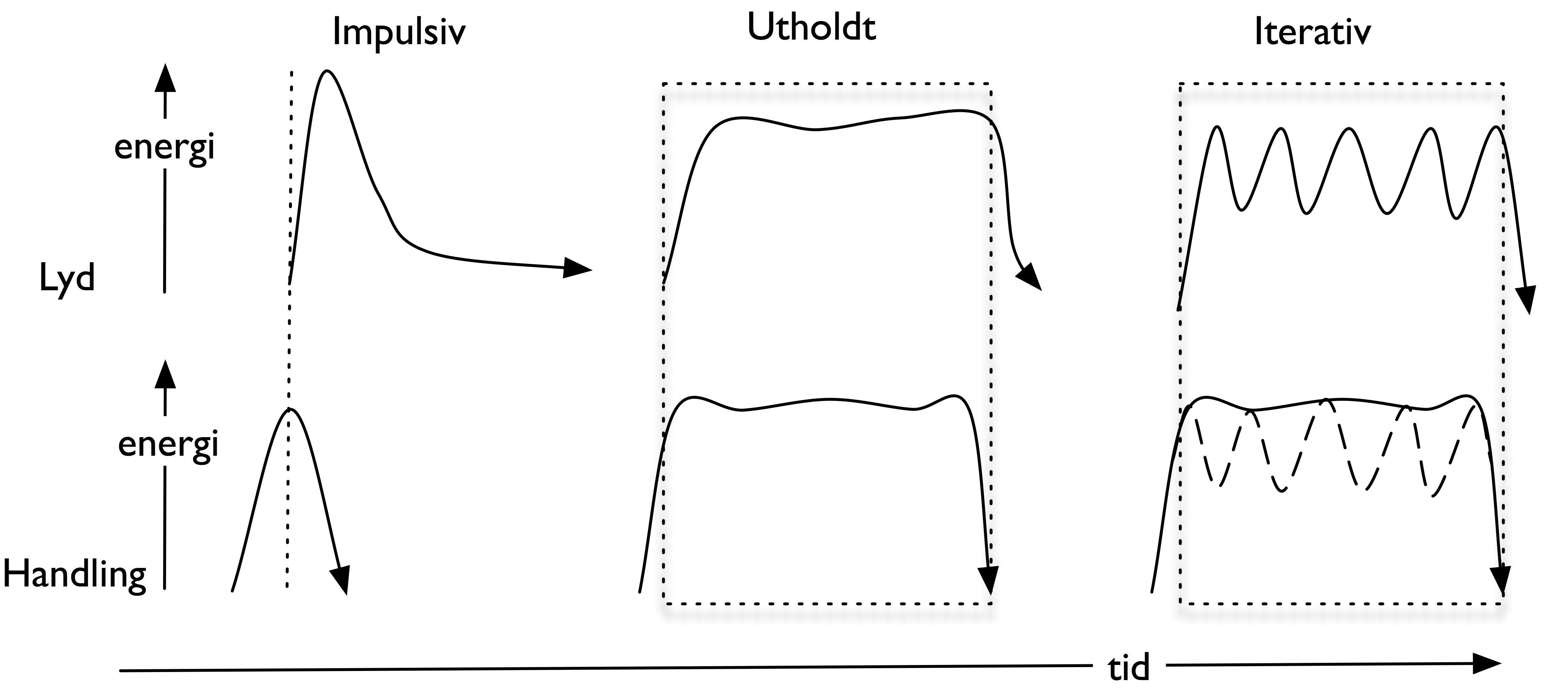 Med utgangspunkt i de tre forskjellige handlingstypene som ble beskrevet i kapittel 2, kan vi definere tre likelydende handling–lyd-typer: impulsiv, utholdt og iterativ (Godøy 2006). En skjematisk oversikt over disse tre typene er vist i figur 54. Den stiplete linjen indikerer hvor eksitasjonen skjer, og viser at lyden alltid oppstår litt etter at handlingen er påbegynt. Dette er fordi det kreves noe energitilførsel for at det klingende objektet skal begynne å resonnere. Tilsvarende er det vanlig at lyden varer lenger enn eksitasjonshandlingen, på grunn av resonans og klang i instrument og rom.