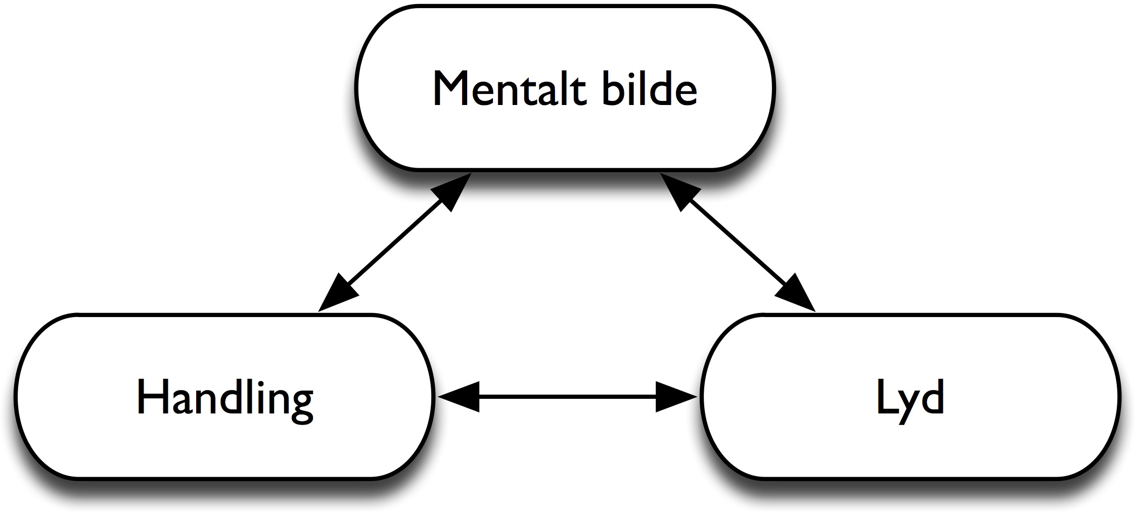 I tillegg til at vi kan identifisere egenskapene til objekter og handlinger fra lyd, er vi også ut fra erfaring dyktige til å forestille oss hvordan en lyd vil høres ut bare ved å se objekter og handlinger. For å forklare slik multimodal sansning av handling og lyd, foreslo Godøy (1997) en modell som viser hvordan handling, lyd og våre mentale bilder av både handling og lyd er knyttet sammen (figur 55). Bruken av begrepet mentalt bilde refererer her til en opplevelse som minner om en perseptuell opplevelse, men uten et eksternt sanseinntrykk. Slike mentale bilder er multimodale, og er ikke bare knyttet til én sans slik ordet kan henlede en til å tro. Snarere kan mentale bilder ses på som et begrep som forklarer evnen til å ”se gjennom det indre øyet” eller ”lytte i hodet”.