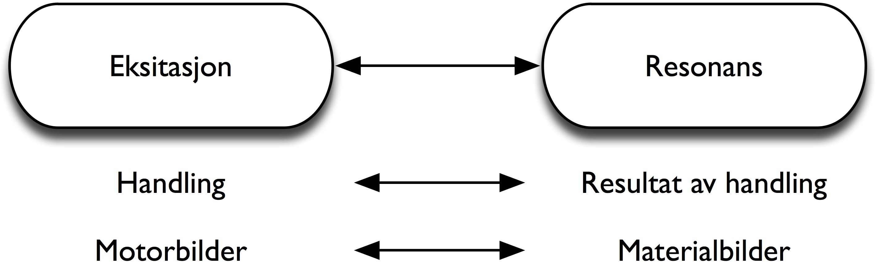 Godøy (2001) har videre foreslått at våre mentale bilder av handling–lyd-koblinger kan deles i motorbilder og materialbilder (figur 56). Her er motorbildene en mental fremstilling av eksitasjonen i den lydproduserende handlingen, mens materialbilder er en fremstilling av resonansen som oppstår som resultat av handlingen. Til sammen dekker motorbilder og materialbilder kvaliteter i både lydproduserende handling og objekt.