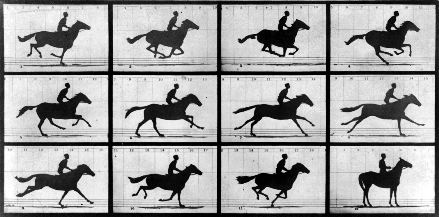 I forbindelse med utviklingen av fotografiet i andre halvdel av 1800-tallet ble det eksperimentert med ulike visualiseringsteknikker. Den britisk-amerikanske fotografen og bevegelsesforskeren Eadweard James Muybridge (1830–1904) er en av de tidlige pionerene på feltet med sine fotografier av hvordan dyr beveger seg. Han er særlig kjent for sine hestefotografier. På 1870-tallet kunne han vise at en hest i galopp har perioder der alle hovene er i luften samtidig, som vist i figur 12. Teknikken han brukte, ble kalt tidsseriefotografier. Han satte opp en rekke med kameraer med en lukkertid på 1/500 sekund. Utløsermekanismen i kameraene var koblet til kabler som var strukket over banen der hesten løp, slik at hesten utløste kameraet idet den passerte (Mozley, 1972). På den måten ble det tatt en serie med fotografier rett etter hverandre som til sammen gir en oversiktlig representasjon av bevegelsessekvensen.