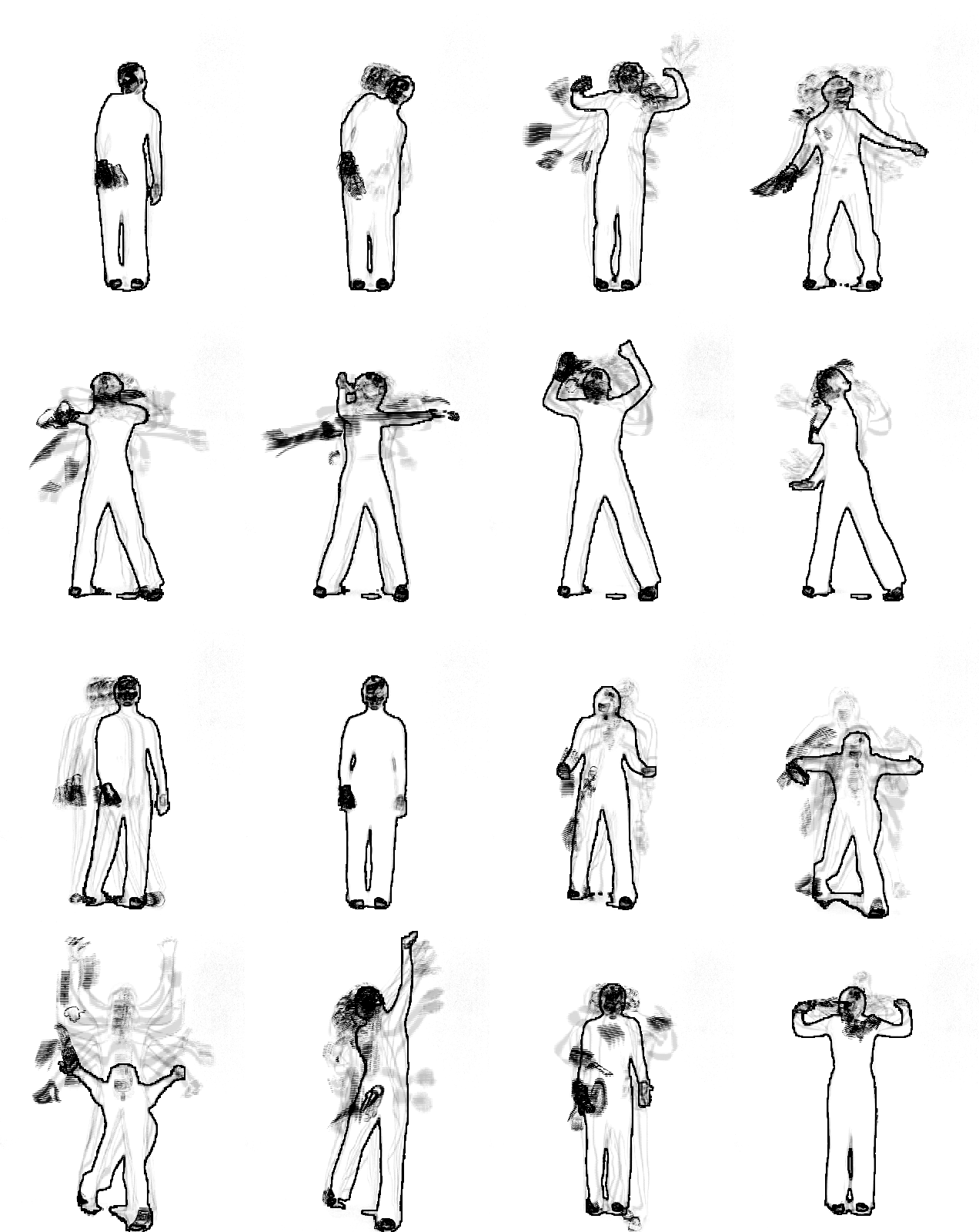 En annen måte å lage slike bevegelseshistoriebilder på er ved å bruke en teknikk som minner om Mareys strobofotografi (se figur 13). Istedenfor å bruke feedback til å skape bevegelseshistorien, plukker man ut enkeltbilder fra videostrømmen som settes sammen til ett bilde. Antallet enkeltbilder som tas med, og hvor stor tidsavstand det er mellom dem, vil avgjøre hvordan bevegelseshistoriebildet ser ut. Eksempler på slike bevegelseshistoriebilder er vist i figur 21 (videoeksempel). Her er det også brukt et kantdeteksjonsfilter som finner omrisset til danserens kropp. Resultatet er at man ser en stilisert utgave av kroppen i tillegg til spor av bevegelsen.