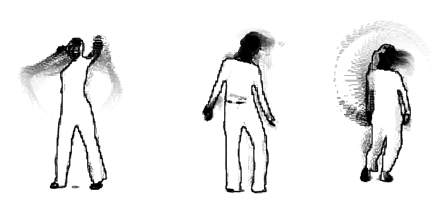 Ved å kombinere flere bevegelseshistoriebilder i ett bilde er det mulig å gjøre studier der man sammenligner ulike bevegelsesmønstre. Figur 23 (video) viser et eksempel på en fremstilling av tre dansere som beveger seg til det samme lydmaterialet.