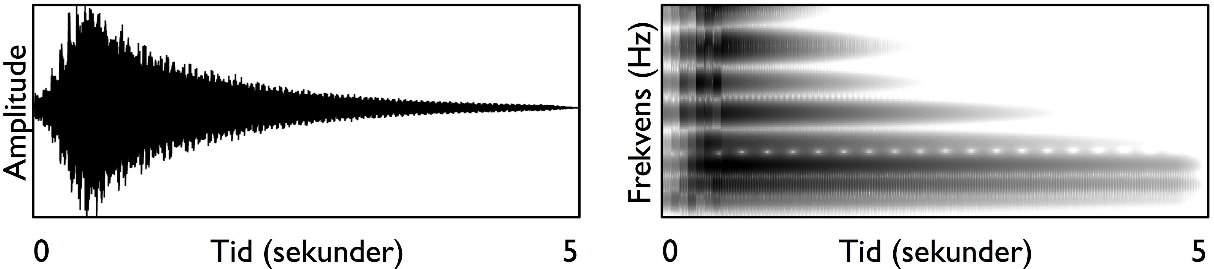 Når vi arbeider med lydanalyse, er det vanlig å visualisere lydsignalet ved hjelp av bølgeformer eller spektrogrammer, slik som vist i figur 24. Bølgeformen viser hvordan amplituden til lyden forandrer seg over tid, og kan derfor brukes til å fortelle noe om hvordan lydstyrken endrer seg. Spektrogrammet gir på den andre siden informasjon om frekvensinnholdet i lyden, noe som kan brukes for å se på hvordan grunntonen og klangfargen til lyden endrer seg. Til sammen gjør disse to visualiseringsformene det mulig å få en oversikt over den kontinuerlige utviklingen av en lyd over tid.