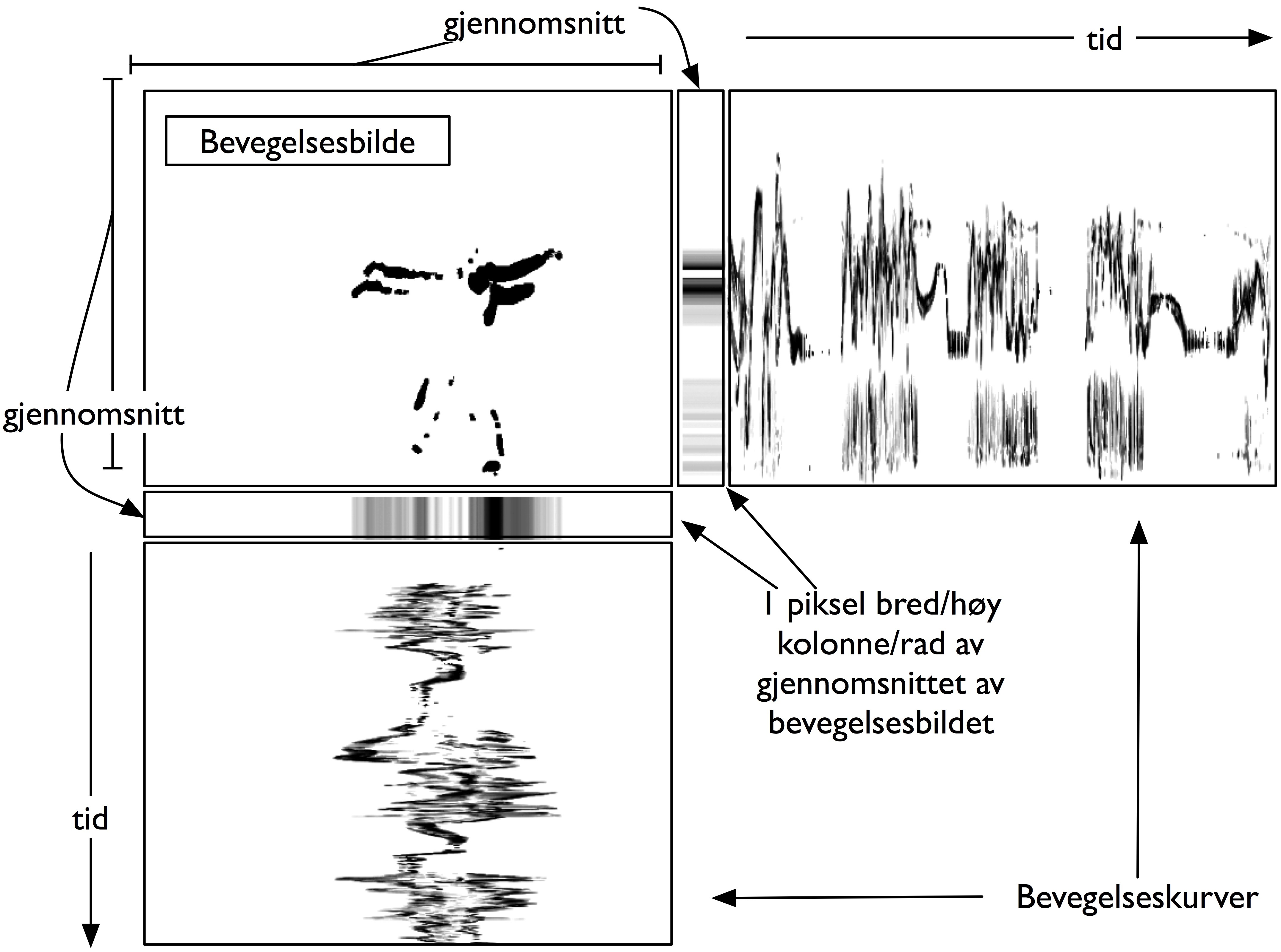 Bevegelseskurver er en teknikk for å lage en tidsbasert fremstilling av et videomateriale med utgangspunkt i bevegelsesbilder (Jensenius 2006). Denne teknikken er inspirert av Mareys strobofotografier, og reduserer videostrømmen slik som vist i figur 25. Metoden tar utgangspunkt i at et videobilde er en matrise med størrelse M x N. M angir her antall kolonner, og N angir antall rader i matrisen. For eksempel vil et bilde med 640 x 480 piksler ha M = 640 og N = 480. For en horisontal bevegelseskurve begynner man med å regne ut gjennomsnittsverdien for hver rad i matrisen. Dette gir en ny matrise med størrelsen 1 x N, altså én piksel bred, og N piksler høy. Hvert punkt i denne matrisen kan ses på som en reduksjon av hver rad i bevegelsesbildet. Når disse 1 x N-matrisene settes etter hverandre, får man en representasjon av bevegelsen over tid. Tilsvarende vil man kunne lage en vertikal bevegelseskurve ved å beregne gjennomsnittsverdien for hver kolonne i matrisen; det gir en M x 1-matrise som kan vises over tid.