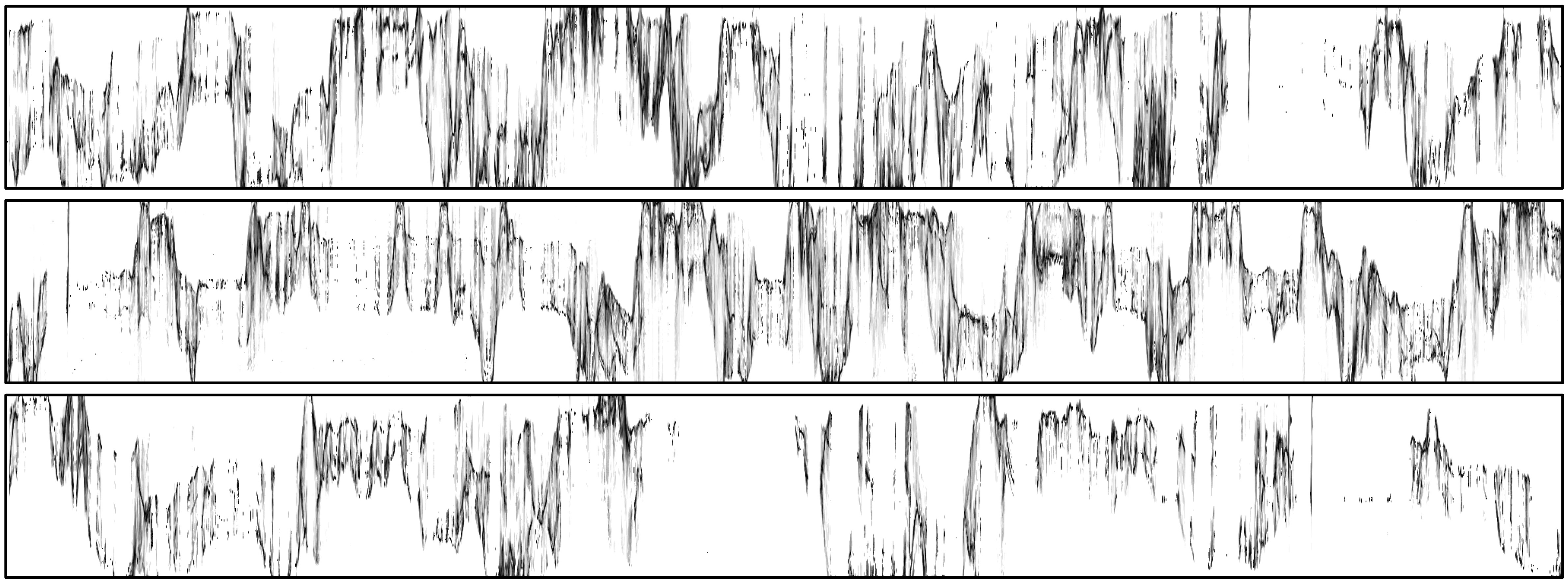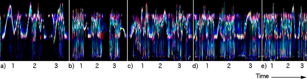 Figur 28 viser de første 40 sekundene av de tre dansesekvensene vist i figur 27. Her kan man se det første musikalske eksemplet, repetert tre ganger. Startpunktet for hver av repetisjonene er markert med svarte linjer. Disse bevegelseskurvene viser flere detaljer og gjør det mulig å følge konturene til hendene og hodene til danserne. Man kan for eksempel se at den første danseren brukte ganske like bevegelser i de tre repeterte utsnittene: én stor, langsom oppadgående bevegelse i armene, etterfulgt av et nedslipp. Slike strukturelle forskjeller kan tydelig ses i bevegelseskurvene, og kan senere brukes som utgangspunkt for en detaljert studie av den originale videoen.