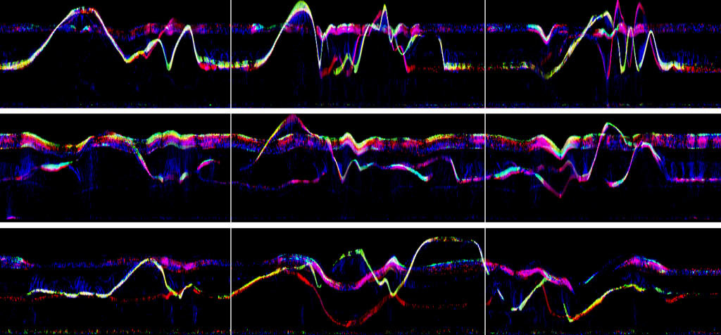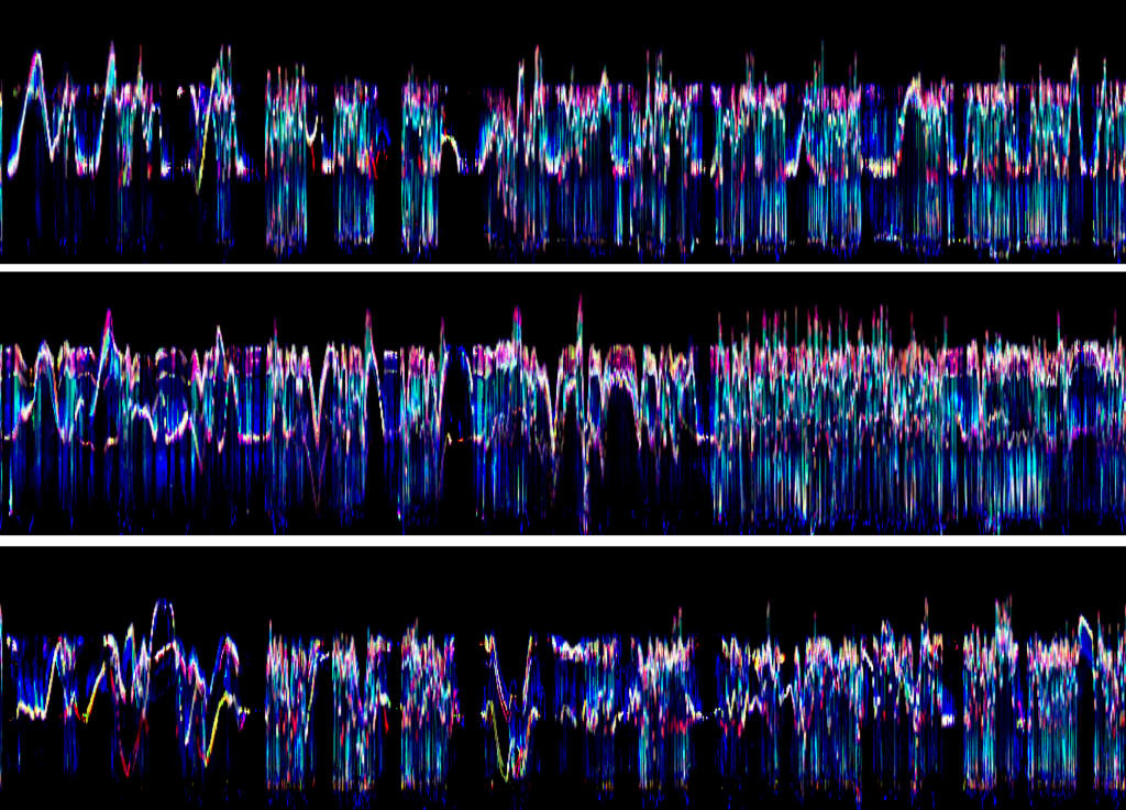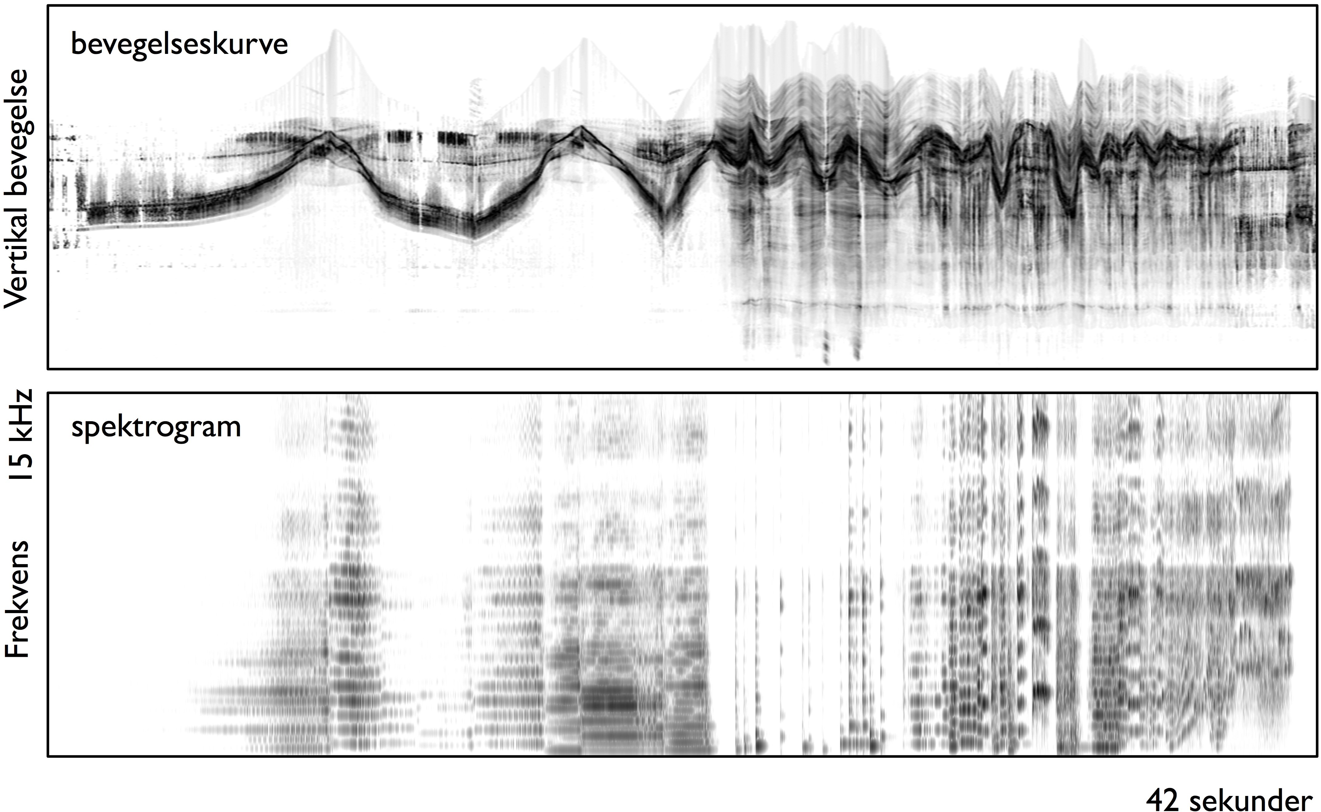 På samme måte som man må lære seg å tolke spektrogrammer av lyd, tar det gjerne noe tid å venne seg til hva en bevegelseskurve representerer. Bevegelseskurven i figur 26 er laget med utgangspunkt i en video av fem minutter med dansebevegelser til musikk. Her løper tiden fra venstre mot høyre, det vil si at begynnelsen av sekvensen er representert til venstre og slutten til høyre. Ettersom dette er en horisontal bevegelseskurve, viser den danserens vertikale bevegelse. Det vil si at håndbevegelser som går opp og ned vil komme tydelig frem som kurver som beveger seg opp og ned i bildet. Hvis hendene derimot bare beveger seg ut til siden vil dette ikke være synlig i bildet, bortsett fra at man kan se at det er aktivitet i det området hvor hendene beveger seg.