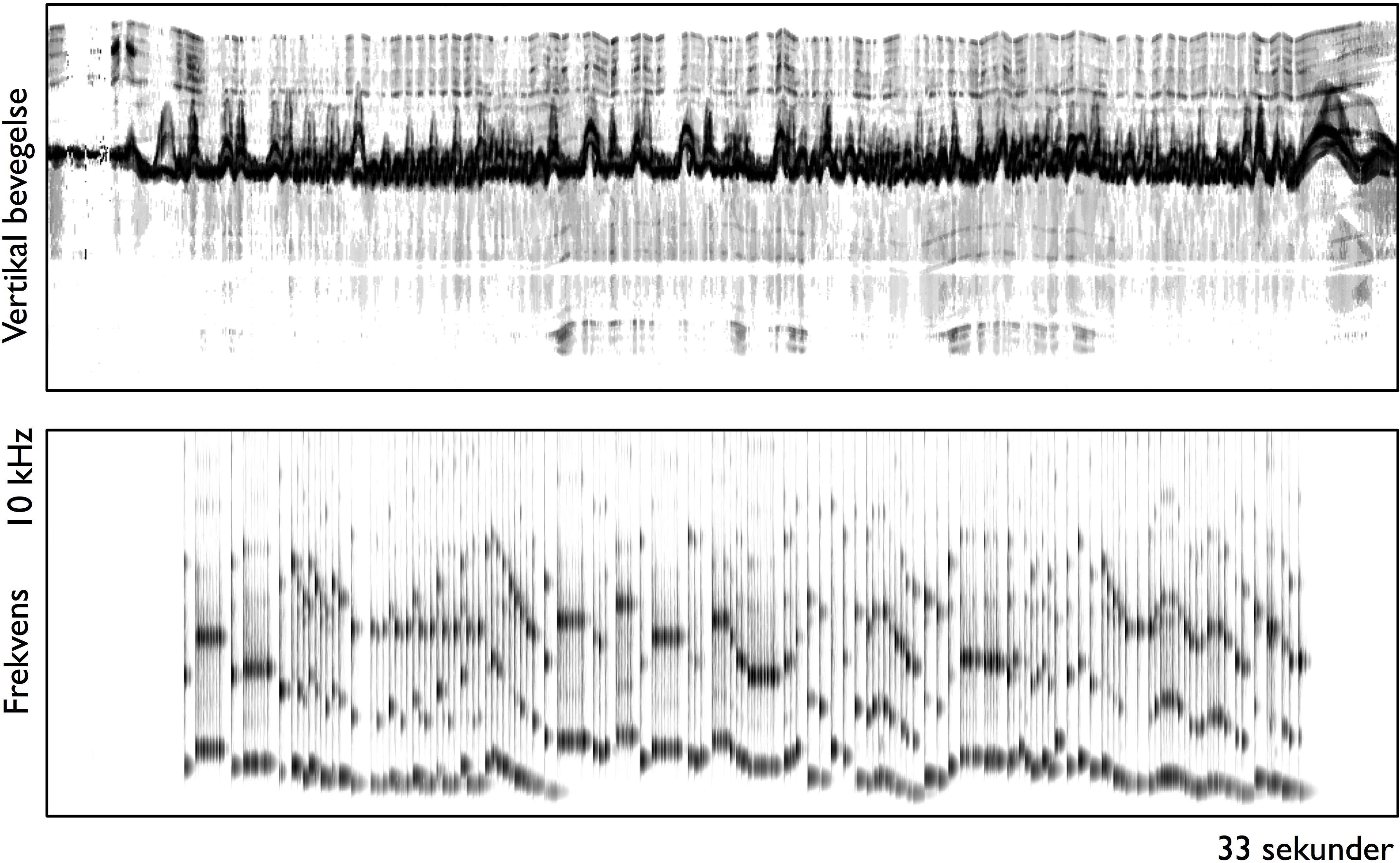 Bevegelseskurver kan brukes til mer enn å studere dansebevegelser. Figur 29 viser en bevegelseskurve og et spektrogram laget fra et videoopptak av en fiolinist som spiller en liten improvisasjon på 42 sekunder. Den første halvdelen av improvisasjonen er basert på lange, utholdte toner, mens avslutningen er preget av en serie raske, korte toner. Hovedlinjen som man kan se i bevegelseskurven kommer fra opp- og nedadgående strøkbevegelser av armen med fiolinbuen. I begynnelsen er det bare denne hovedlinjen som er synlig, noe som tyder på at utøveren står nesten stille med resten av kroppen. I andre halvdel kan man tydeligere se at hele kroppen er i bevegelse sammen med strøkbevegelsene. Ved å sammenligne bevegelseskurven og spektrogrammet kan man se hvilke bevegelser som er lydproduserende, samt legge merke til hvilke ikke-lydproduserende bevegelser som er tilstede i utøvelsen. Vi skal se nærmere på forskjellige typer musikkrelaterte bevegelser hos utøvere i kapittel 5.