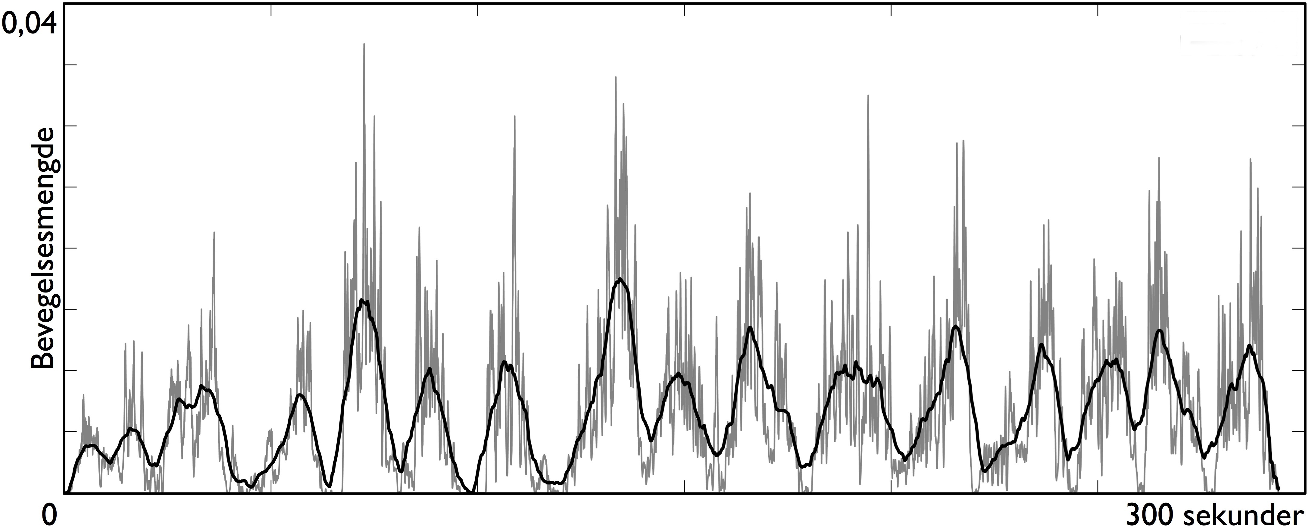Figur 36 viser bevegelsesmengden som er beregnet fra dansesekvensen som ble beskrevet tidligere i dette kapitlet. Den lysere grafen viser en ufiltrert versjon av bevegelsesmengden, og den mørkere grafen viser en filtrert versjon av de samme tallene. På grunn av visuell støy i bildet, er det vanlig å måtte filtrere dataene for enklere å kunne se bevegelseskonturene. En slik graf illustrerer hvor mye bevegelse det er i de forskjellige delene av en bevegelsessekvens, og kan brukes som utgangspunkt for videre analyser.