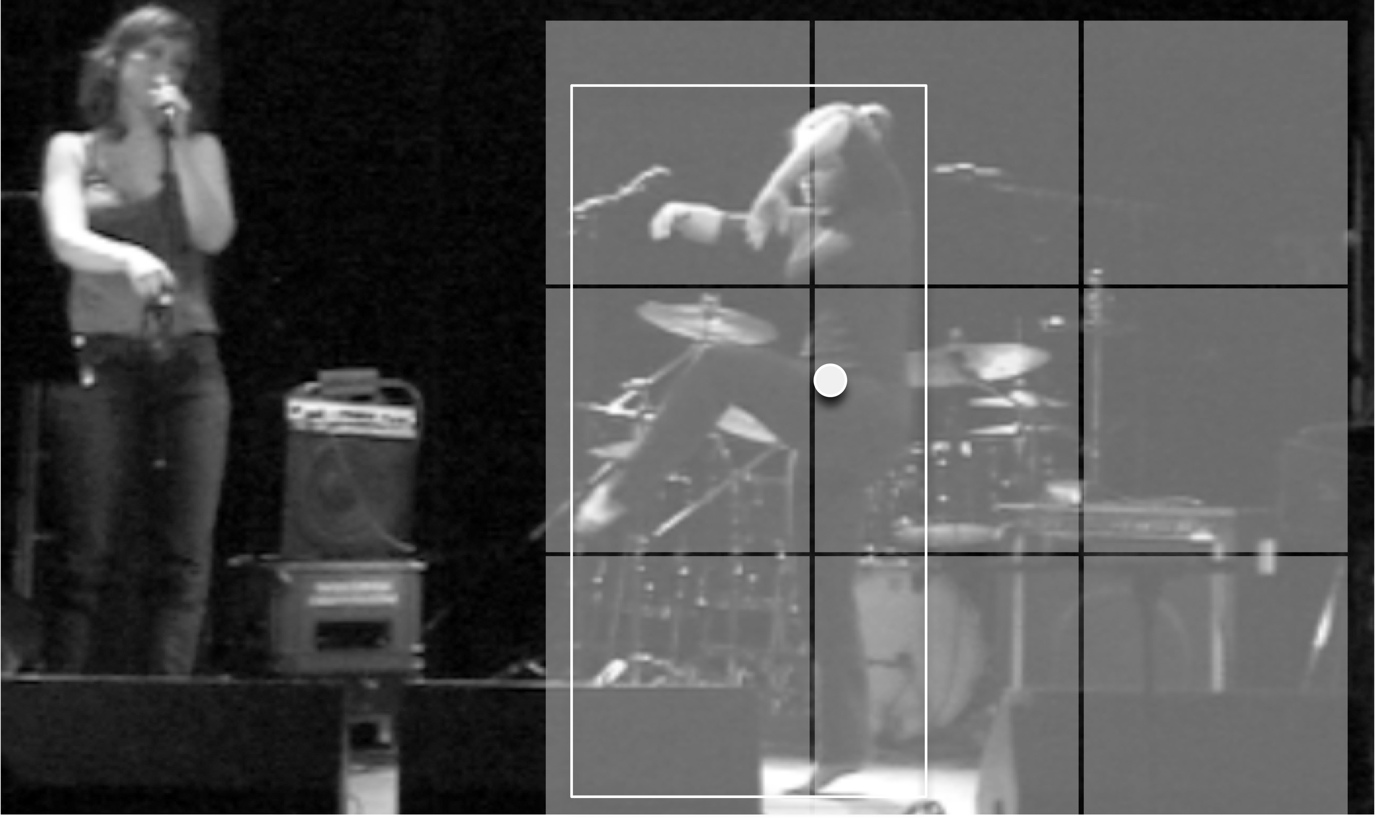 Ettersom de kvantitative analysene som er nevnt her kan kjøres i sanntid, er det mulig å bruke tallmaterialet til kontroll av lyd eller bilde. Figur 38 (video) viser et bilde fra en oppføring av stykket Whiteness I Remember på Blå i Oslo i desember 2005. Dette var et interaktivt stykke som ble utviklet sammen med Åshild Ravndal Salthe (dans) og Maria Fonneløp (sang). Ved hjelp av et videokamera og selvutviklet programvare ”spilte” danseren egen lyd i improvisasjon med sangeren. Her ble massesentrum, kroppsareal og bevegelsesmengde brukt for å styre parametre i den elektroniske lyden. I tillegg brukte vi 3 x 3 virtuelle soner der danseren kunne styre forskjellige lydhendelser separat i hver sone.