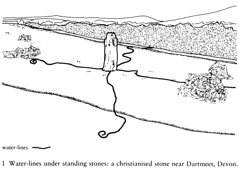It is with underground water-courses, and with the traditional role of dowser as water-diviner, that we find our first clues about the placing of ancient sacred sites. Dowsers have discovered, often independently of one another, that water-lines, the underground waterbearing courses or fissures, intersect beneath many types of sacred site: not just the obvious ones, like the holy wells, but barrows, standing stones, stone circles and dolmens. The first reports on this that I know of, in 1933 and 1935, were both French;11 the first report in English seems to be Captain Boothby’s article The Religion of the Stone Age in 1935.12 Boothby described how he found that waterbearing fissures - or ‘springs’, as he called them - ran underneath a tumulus that an archaeologist he was visiting was working on. After finding that the same applied to every barrow he visited, including long barrows, he decided that ‘it would appear that the whole layout of these ancient monuments is based on subterranean water; but’, he added, ‘until the whole has been tested it is impossible to be certain about this’, and he called for other dowsers to test his results for themselves.