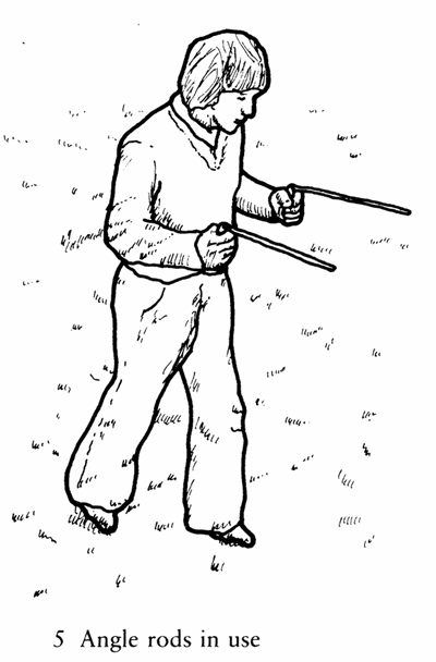 A lot of dowsers still use Creyke’s method. The procedure is that you first have to find the exact centre of the water-line, and then, at a point exactly on that centre-line, hammer a large metal stake into the ground. Immediately, as far as the dowser is concerned, the waterline disappears, to be replaced by a circle around the point. According to the original system the radius of that circle is the depth of the stream at that point. There are variations: for some dowsers the radius of this circle is only a half or a third of the actual depth - which can cause embarrassment at times - and other dowsers don’t actually stake the water-line, but rather place large lumps of metal or, in one case I know of, a small amethyst crystal, on the ground at the centre of the water-line.