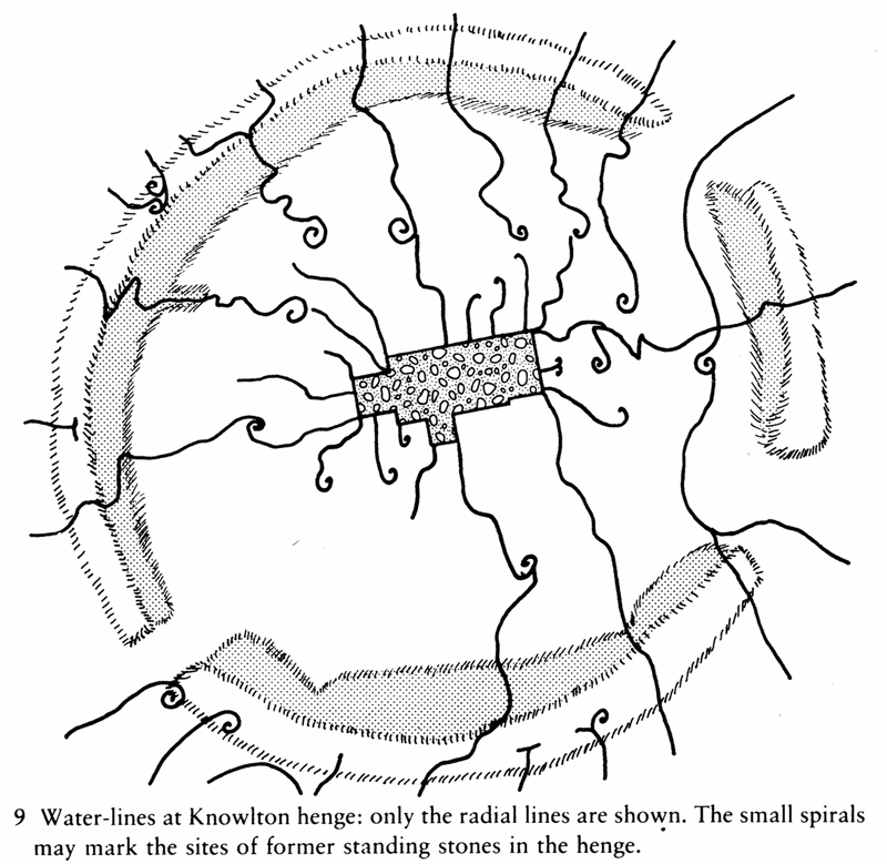 Underwood’s earliest experiments produced results very similar to those of Boothby and Smith. He found that water-lines intersected beneath sacred sites such as barrows, standing stones and henges. He also found, though, that water-lines formed large spirals round stones, several spirals converging on the same stone or stone circle in some cases, as at the Sanctuary near Avebury. As far as he was concerned, the water-line was triple, three close and near-parallel lines making up each water-line; and he felt that this triplicity of the lines had been deliberately used in the past to determine the shapes of - for example - henge ditches, as the outer influence lines seemed to move outward from the central line following the centre of the ditch, to coincide with the often erratic outer edges of the ditch. But there are other interpretations, and his critics maintained that this was proof that the influence lines he plotted out were the result of the shape of the ditch rather than the cause of it. Underwood denied this, of course, but the key question of cause or effect remained open, despite his efforts to resolve it in his favour.