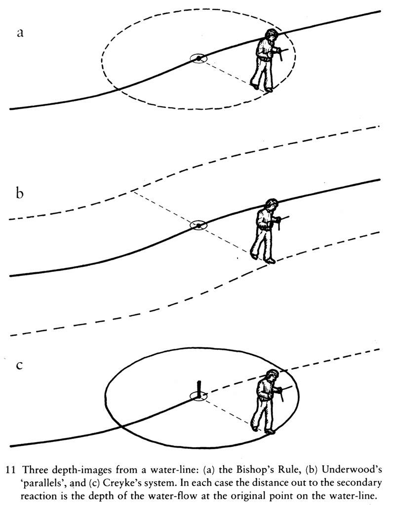 Underwood uses the term ‘parallel’ for an image version of the so-called Bishop’s Rule, a depth-finding technique that has been used by dowsers for centuries. Underwood’s ‘parallels’ run parallel to the water-line and separated from the centre of the apparent line by a distance approximately equal to the depth of the water-flow at that point; while the Bishop’s Rule states that if you walk outward from directly above the centre of the water-line, you will get a second reaction of your dowsing-rod at a distance out that coincides with the depth of the stream at the point which you started from. In both cases the rule is that ‘the distance out equals the distance down’; Underwood’s ‘parallels’ can be seen as the loci derived from measuring the Bishop’s Rule outward from an infinite number of points on the water-line. Underwood’s ‘flow-lines’ are small feathery lines, usually S-shaped, formed on both sides of the water-line; they follow the apparent strength and direction of flow, rather like the eddy-currents formed in still air by the passing of a car.