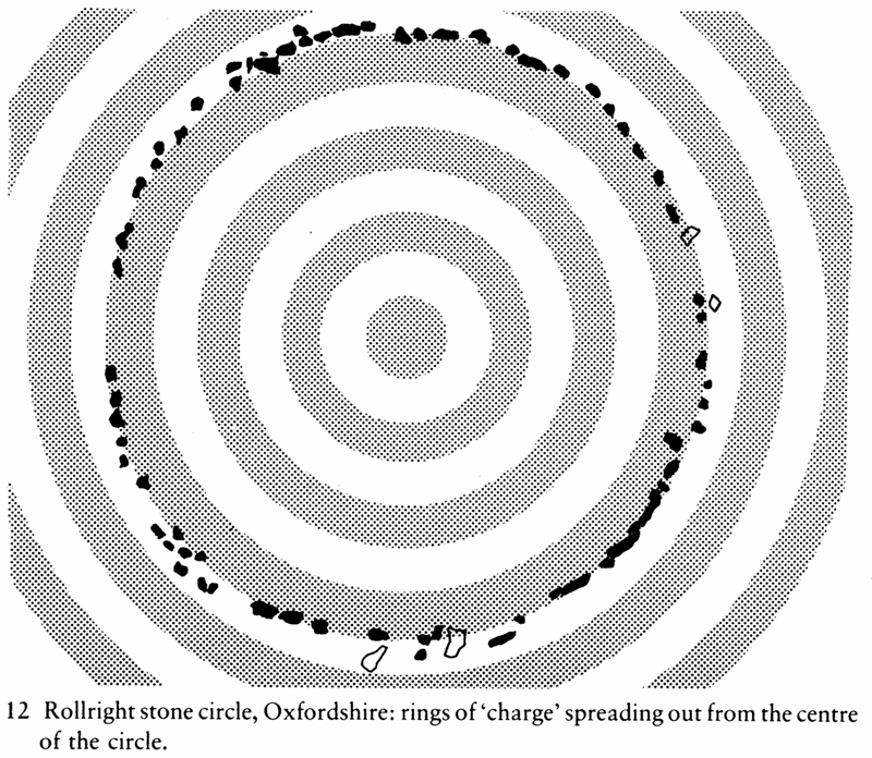Whole areas can also be polarised in relation to others, mainly at ground level, but possibly above or below. During that survey at Rollright, using angle rods, I discovered a set of concentric rings of alternating charge: the rods crossed on passing through the line of the stones, opened out again further towards the centre of the circle, and repeated this ‘opening and closing’ to give seven concentric rings around the centre. It would seem that the polarities here are relative rather than the more absolute positive and negative, for I found that if I started with rods crossed, they opened out as I passed through the line of the stones, and so on in reverse to the centre of the circle. The effective pattern is similar to what Underwood called a ‘halo’, a set of concentric rings around a major point, such as the intersection of nave, chancel and transepts in a cathedral; it’s also like a multiple version of the pattern produced in the Creyke system of depthing described earlier.