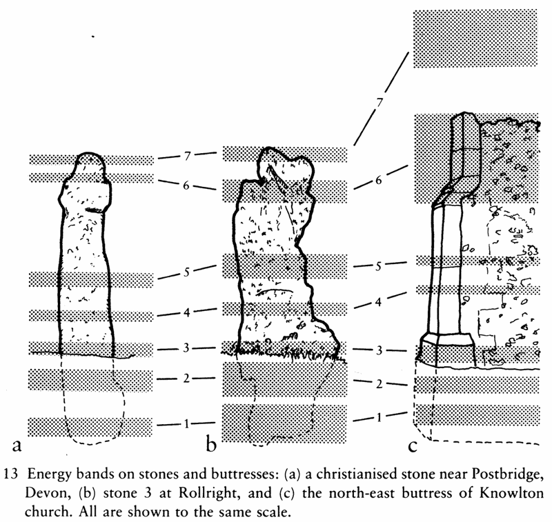 I once showed Paul Devereux, editor of The Ley Hunter magazine, how to find this fifth band effect, working on one of the main stones at Avebury and on the tower on top of Glastonbury Tor. Since he hadn’t been able to dowse before this time, his comments are interesting. He said that the immediate effect of the fifth band was ‘like when you’ve had just one drink too many’: it was a feeling that hit him as soon as he made contact, and this sense of a loss of balance developed, in a couple of seconds, into a definite ‘push’ to one side. It’s interesting to see how specific this effect is: on the west-end buttresses of the tower on Glastonbury Tor it could only be felt from a narrow band about six inches high and around four feet off the ground, while it couldn’t be found at any height on the east-end buttresses. Since the latter were only put up to support the tower after its church had collapsed in an earthquake, and were thus not part of the original layout of the church, that perhaps isn’t so surprising.