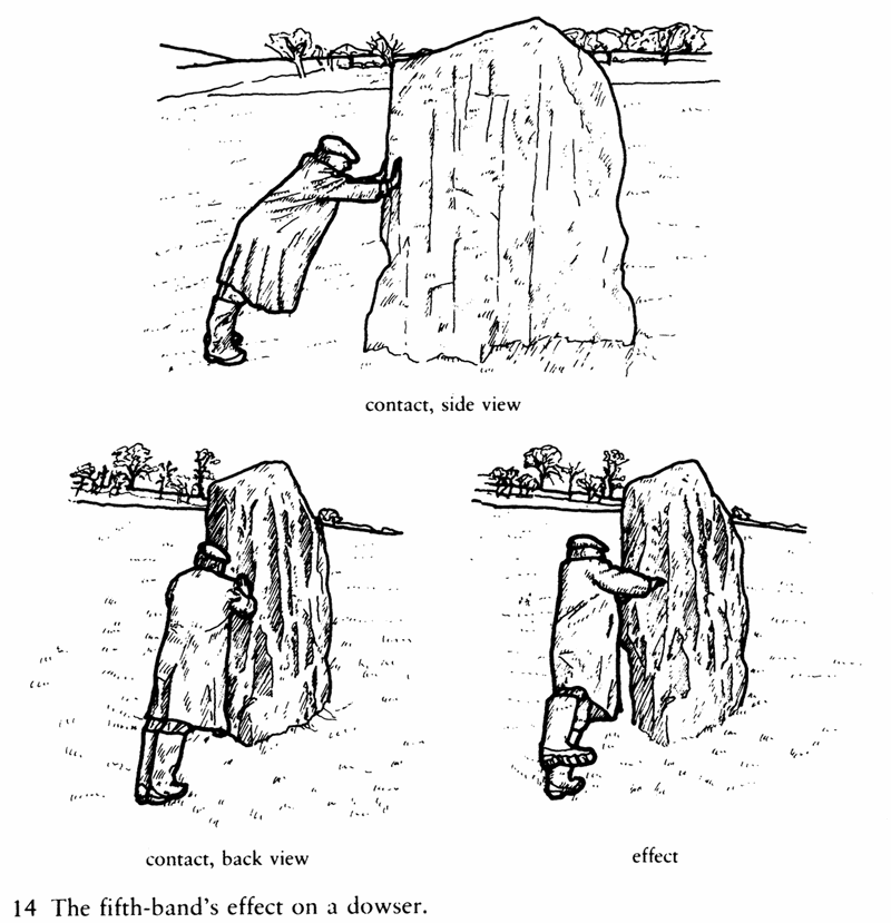 Taylor’s work was also limited in that, again like Underwood, he assumed that any polarity around the stone must be solely electromagnetic. This is an assumption which forty-years’-worth of their own research into the physical factors of dowsing has taught dowsers to beware.34 Most dowsers would agree that an electromagnetic component is involved, but many of those I’ve discussed the matter with have suggested that this may only be a side-effect of something, some energy, on what they would call another ‘level’. Each time someone tries to pin down any ‘cause’ in dowsing to one specific physical mechanism, it suddenly stops and reappears as some other apparently physical mechanism. This effect is well-known in other research on the mechanisms behind psychic phenomena, particularly psychokinesis: it’s sometimes called the ‘bloody-mindedness’ of those phenomena.35
