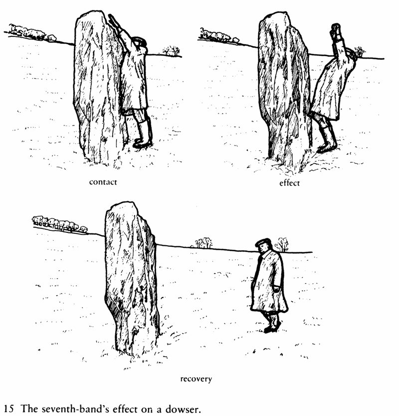 We were wrong, of course. Using a pendulum in one hand, I used my other arm as a pointer, to find the former height of the tip of the stone. We did, at about seventeen feet: but at the same time we found the ‘memory’ of the stone’s seventh band. It was quite a reaction. I’m not quite sure what happened then, since all I remember is jumping back with the shock, but my wife, who was watching at the time, tells me that my arms went out wide, and I only just managed to keep upright. My friend went sprawling on the ground about ten feet back from where he started, for, being ‘booster’, he’d caught the brunt of what I’d managed to dodge. It was several minutes before either of us recovered enough to start work again.