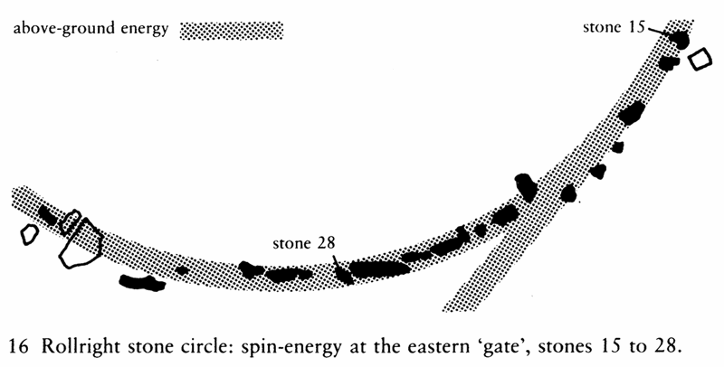 The local communications, the pulses jumping from stone to stone on a site, show up in other ways that we’ve come across already. At stone circles, one set of pulses jumps from stone to stone either clockwise or anticlockwise round the circle, forming the apparent spin of energy; and other pulses, jumping around in a less obvious sequence, change the polarities of the stones on their regular and irregular cycles. From a dowser’s point of view, watching these pulses move around on a complex site like Rollright, it is no exaggeration to describe the site as ‘living, breathing, pulsing’.