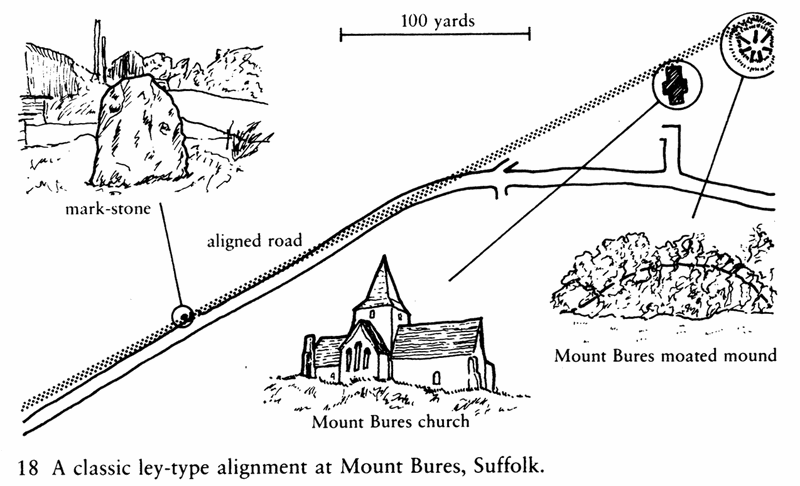 Over the next few years, Watkins’ thesis changed a little, becoming more complex and sophisticated. In his most important book, The Old Straight Track, published in 1925, the different traders’ tracks are identified by different groups of place-names - ‘white’ or ‘wick’ for salt, for example, and ‘knap’ or ‘chip’ for flint - and the Beacon Hills are added to the list of mark-points. By 1927, when he published his Ley Hunter’s Manual, the list of mark-points had grown, in their order of reliability, to the following: prehistoric mounds (except where closely clustered together), moated mounds, wayside mark-stones (where distinguishable from casual ‘erratic’ stones), circular moats, castle keeps (usually on old mounds), Beacon Hills and similarly named mounds (like One-Tree Hills), wells with traditional names, old churches (especially if on a mound or other evidence of prehistoric use of the site, or with certain types of related folklore), ancient crosses, alignments of road or trackway, fords, traditionally-named tree-groups or single trees (especially if Scots Pine), hillside notches, and crossroads, zigzags and other road junctions.