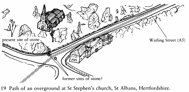 Another difference between the classic model and that implied by the overgrounds is that a ley can still be real and ‘active’ even if one or more of its sites has been moved. The overground doesn’t actually divert from its original straight course, but on reaching the original site of the mark-stone (or whatever) sends out what some dowsers have termed a ‘ray of union’ to connect the stone to the original line. There is an example of one of these in St Stephen’s churchyard in St Albans in Hertfordshire: the three-foot-high mark-stone just inside the churchyard wall, according to Bill Lewis’s and my dowsing results, was originally in the middle of the ancient Watling street, which comes to a crossroads just by the church. The stone was moved at some time from the middle of the road to the footpath, and then again from the footpath into the churchyard, for the overground that runs (unusually) up the middle of the road does an apparent sharp double bend to ‘talk to’ the stone before continuing on its way north. So far the maximum distance found between a moved structure and its original site, where the structure is still ‘talking’ in this way to the original site, is about half a mile.