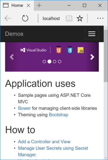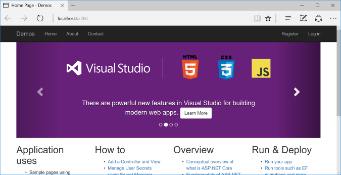 That application also has a menu above, with links that take me to almost empty “About” and “Contact” pages. Also note that we already have fully-functional “Log in” and “Register” links for user authentication. If I use them, a local SQL Server database will be created for storage.