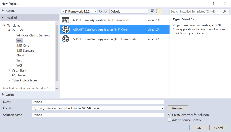 I’m taken to the New project dialog box. From the left menu I’ll select Visual C# since it’s the most common coding language for .NET, then Web. In the middle pane I’ll select ASP.NET Core Web Application (.NET Core). In the lower part of the dialog box, next to the Name: label I’ll type the name of my project: Demos.