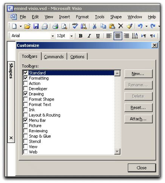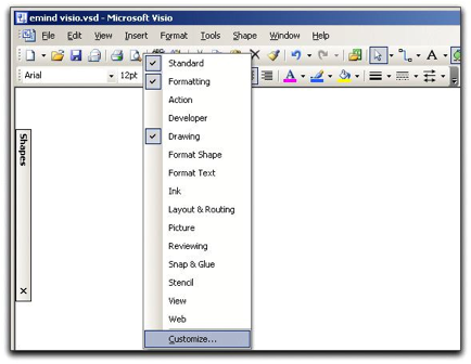By default, Visio displays two tools bars across the top of the menu. These toolbars are consistent across all Microsoft Office products and are probably there to make you “feel nice” when you start Visio. But many of the buttons on the toolbar are never used, and more sophisticated users will use keyboard shortcuts instead of the buttons.