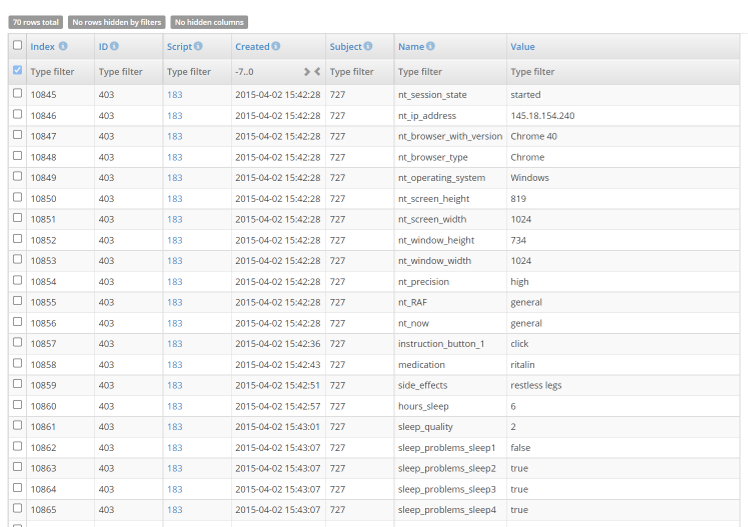 If you go to a script and then click on the table icon, you will see all data collected by that script during experimental sessions; each time log() was called another row was added to the table. If you have many subjects taking your tests and if you collect much data per script, this may result in thousands of rows. Fortunately, the data tables offer several ways to make inspection of your data more manageable, notably sorting and filtering.