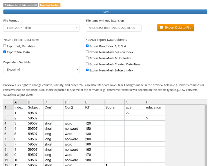The data dashboard has a preview table to give you an idea of your data and options to show/not show data index, subject ID, etc. You can also hide the trial data (i.e., that stored with logtrial()), export only nt data (with technical properties of subjects’ browsers), only data from one condition, etc.