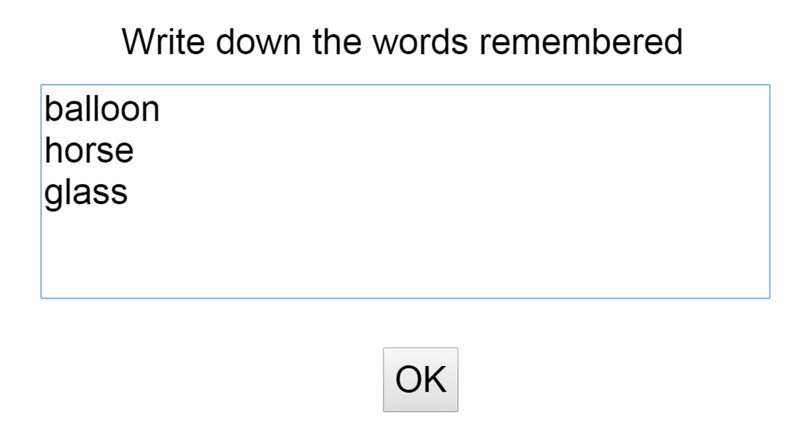 After this 25 s interval, a text box would appear with the label, “Write down the letters remembered” above it. There is an “OK” button below the text box that is automatically generated by the input function so that subjects can move forward when they’ve finished typing.