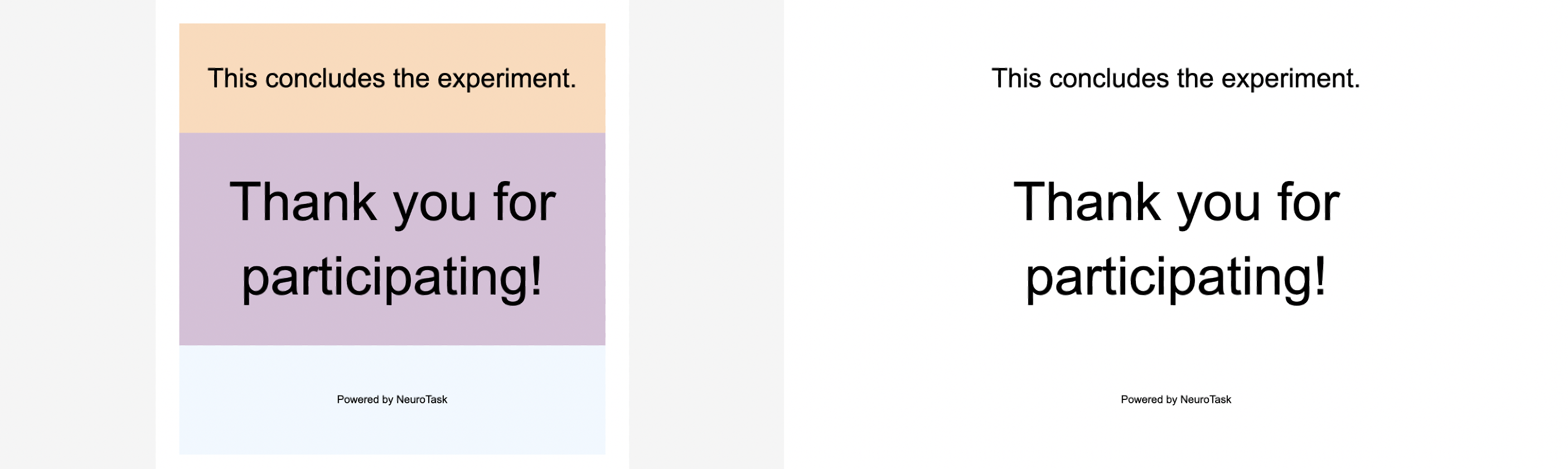The fill layout makes most efficient use of the display (screen or window) real-estate. An important drawback to consider is that the displays your subjects use can vary greatly, from extremely short and wide to extremely tall and narrow. It is possible to design webpages that adjust themselves to such extremes, for example, by using a framework like Twitter Bootstrap. This is the styling framework we use for the NeuroTask website and we highly recommend it. This fluidity is fantastic for webpages, but for experiments you almost always want to control where screen elements go. Therefore, for optimal control over your experiment’s display, we strongly recommend the square format. In the end, it is up to you if and when you want to use the fill format. For example, you may want to use it when showing instructions or when presenting survey questions.