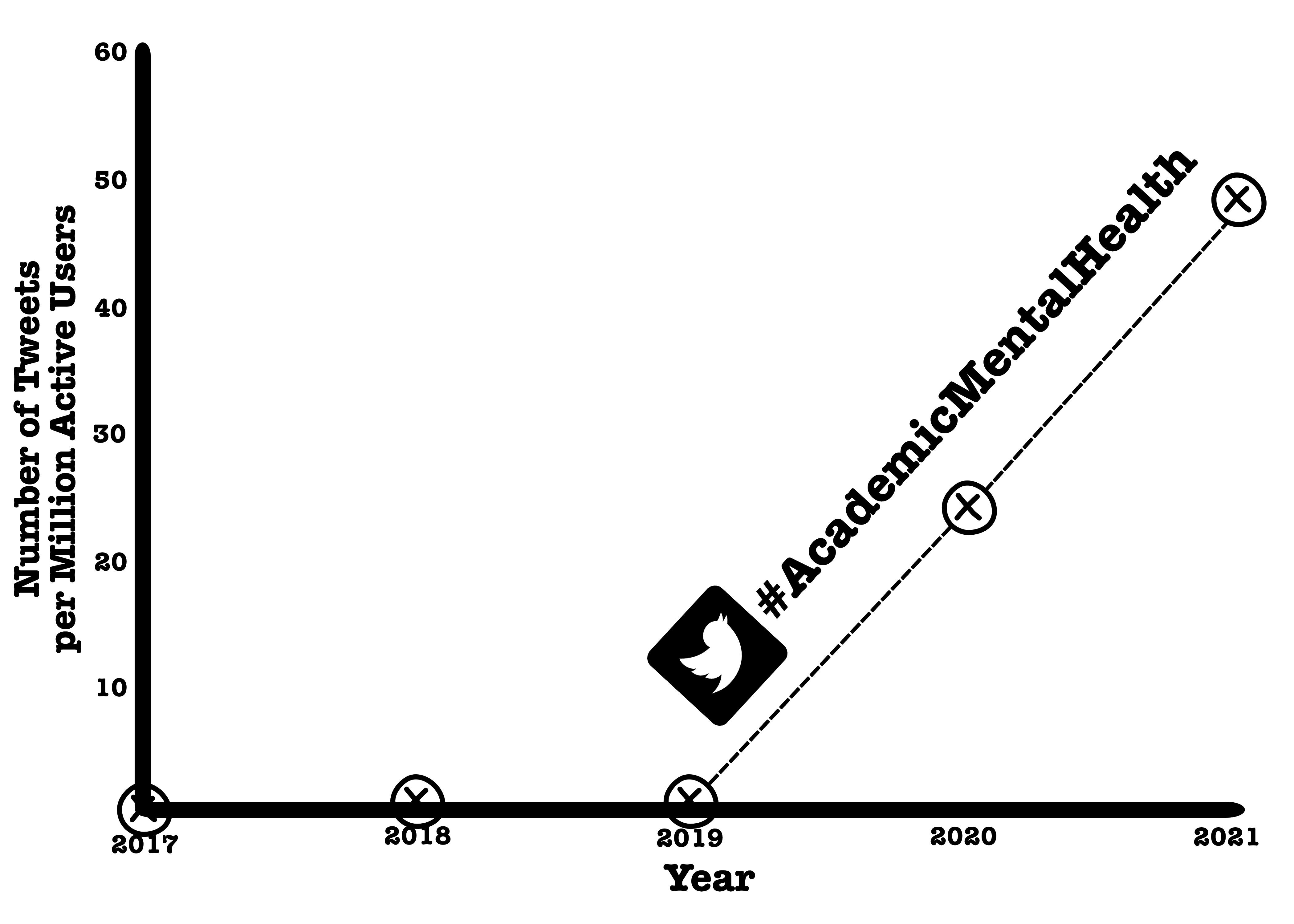 In 2020, a related report from Wellcome painted no prettier picture, sharing the dire statistic that over half of researchers in the UK and globally have sought support for anxiety or depression.9 On Twitter, I personally scraped 15,000 tweets on the subject of academic mental health posted between 2017 and 2021. 99% of those tweets fell within the last two years.